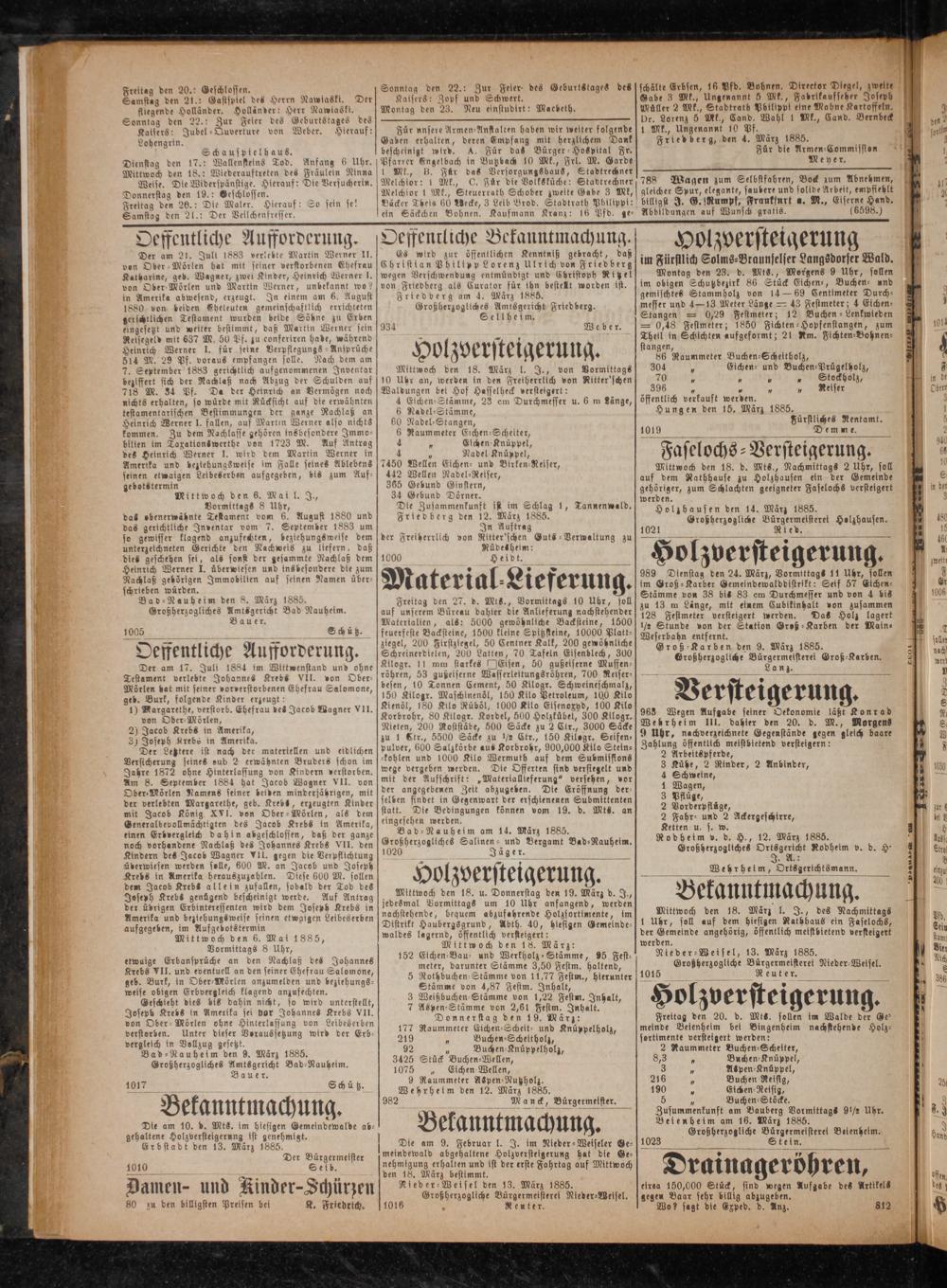 Oeffentliche Aufforderung. Der am 21. Juli 1883 verlebte Martin Werner II. von Ober-Mörlen hat mit seiner verstorbenen Ehefrau Katharine, geb. Wagner, zwei Kinder, Heinrich Werner J. von Ober-Mörlen und Martin Werner, unbekannt wo? in Amerika abwesend, erzeugt. In einem am 6. August 1880 von beiden Eheleuten gemeinschaftlich errichteten gerichtlichen Testament wurden beide Söhne zu Erben eingesetzt und weiter bestimmt, daß Martin Werner sein Reisegeld mit 687 M. 50 Pf. zu conferiren hade, während Heinrich Werner J. für seine Verpflegungs⸗ Ansprüche 514 M. 29 Pf. voraus empfangen solle. Nach dem am 7. September 1883 gerichtlich aufgenommenen Inventar beziffert sich der Nanleß nach Abzug der Schulden auf 718 M. 34 Pf. Da der Heinrich an Vermögen noch nichts erhalten, so würde mit Rücksicht auf die erwähnten testamentarischen Bestimmungen der ganze Nachlaß an Heinrich Werner J. fallen, auf Martin Werner also nichts kommen. Zu dem RNachlasse gehören insbesondere Immo— bilten im Taxationswerthe von 1723 M. Auf Antrag des Heinrich Werner J. wird dem Martin Werner in Amerika und bezitehungsweise im Falle seines Ablebens seinen etwaigen Leibeserben aufgegeben, bis zum Auf— gebotstermin Mittwoch den 6. Mai l. J., August 1880 und