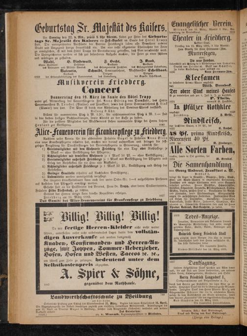 Am Sonntag den 22. d. Mts., präcis 8 Uhr Abends, findet zur Feier des Geburts- tags Sr. Majestät des Kaisers ein Fest⸗ Bankett im Saale des Hotel Trapp statk. Die unterzeichneten Vorstände der Vereine Friedberg's laden alle Bewohner unferer Stadt und Umgegend hierzu freundlichst ein. Um eine recht allgemeine Theilnahme der Feier zu ermöglichen, ist mit dem Hötel Trapp die Vereinbarung getroffen, daß Bier verabreicht wird. Die Unterzeichneten werden es sich zur besonderen Aufgabe machen, die Feier zu einer schönen und würdigen zu gestalten.