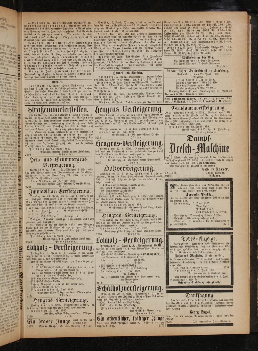 Jacob Volk, im 76. Lebensjahr nach längerem Leiden zu sich genommen hat. Friedberg, 16. Juni 1885. Lina Volk, Richard Volk, Ida Volk, geb. Dieterich. Beerdigung: Donnerstag Abend 5 Uhr. Besondere Einladung erfolgt nicht. 0 Man bittet freundlichst, die Blumenspenden zu unterlassen. 2217