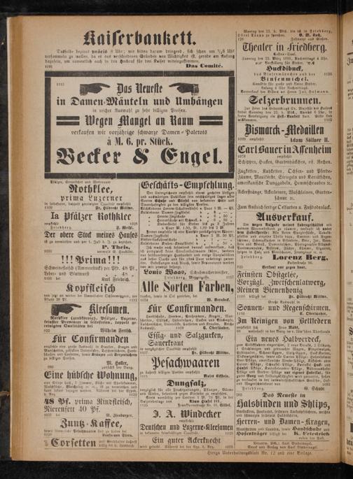 Dasselbe beginnt präeis 8 Uhr; wir bitten darum dringend, sich schon um ½'8 Uhr versammeln zu wollen, da es aus verschiedenen Gründen von Wichtigkeit ist, gerade am Anfang dazusein, um namentlich auch in den Hochruf für den Kaiser miteinzustimmen.