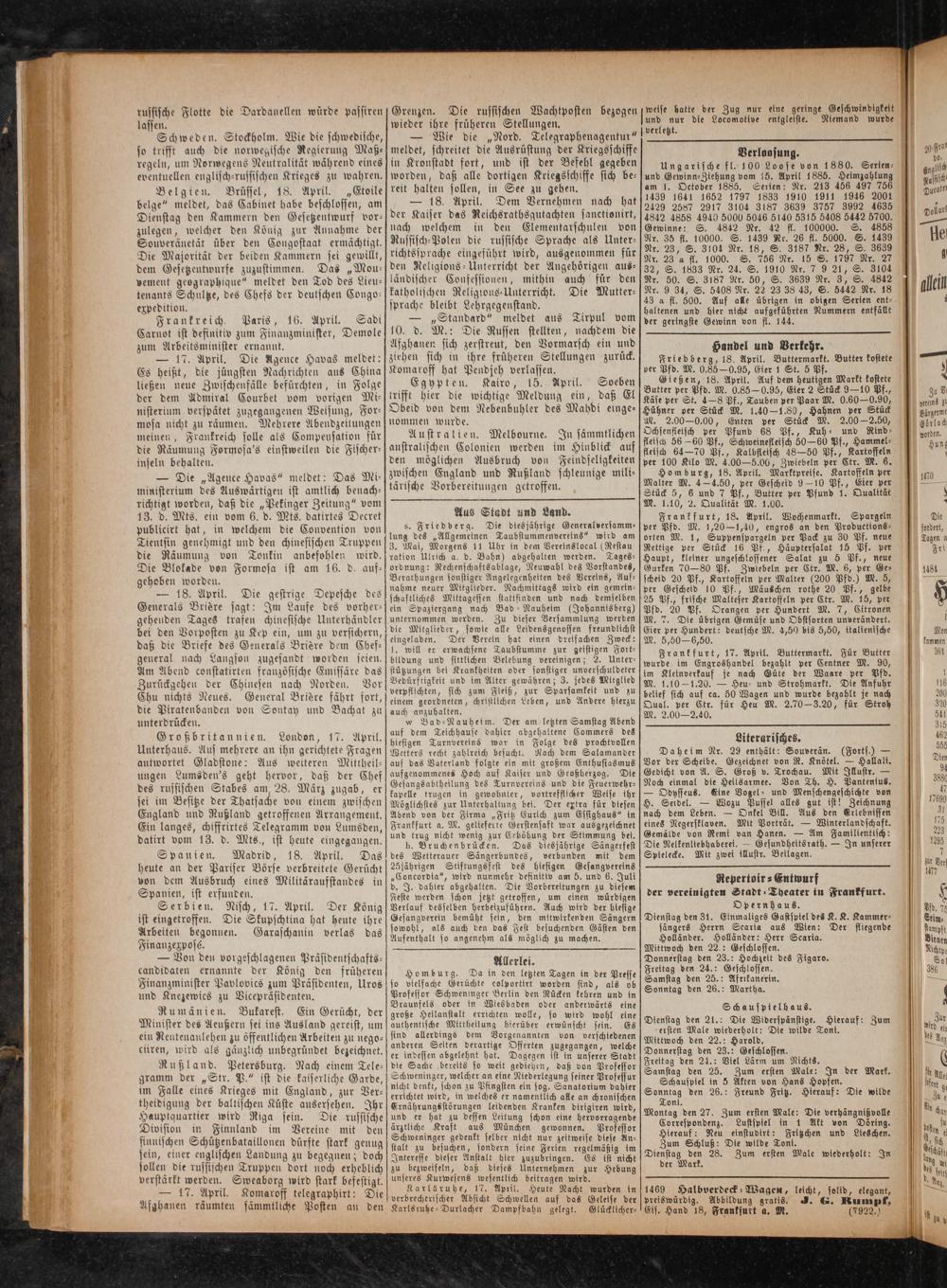 Frankfurt, 17. April. Buttermarkt. Für Butter wurde im Engroshandel bezahlt per Centner M. 90, im Kleinverkauf je nach Güte der Waare per Pfd. M. 1.10 1.20.— Heu- und Strohmarkt. Die Anfuhr belief sich auf ca. 50 Wagen und wurde bezahlt je nach Qual. per Ctr. für Heu M. 2.70 3.20, für Stroh M. 2.00— 2.40.