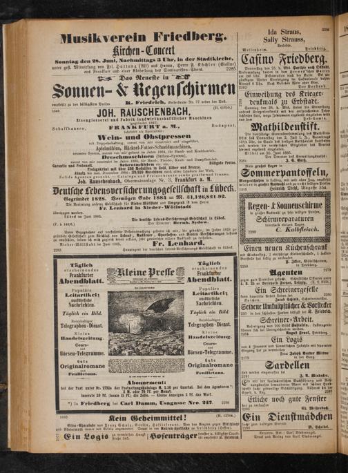 Nieder⸗Wöllstadt im Juni 1885. Fr. Lenhard. 2288 Hauptagent der deutschen Lebens-Versicherungs-Gesellschaft in Lübeck.