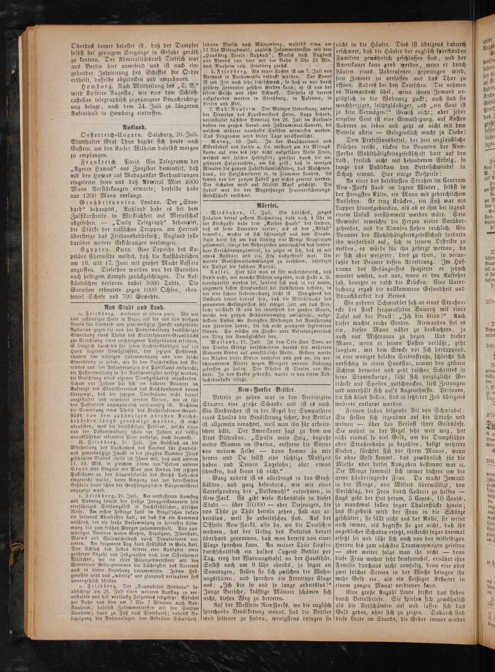 An einer der belebtesten Straßen im Centrum New⸗Porks stand im letzten Winter, selbst in der strengsten Kälte, ein Mann mit gebrechlichem Aussehen. Er trug Krücken, ein Fuß war mit Lappen hinaufgebunden, als ob er ihm bei irgend einem Unfall verstümmelt worden wäre. Sein Gewinsel erweichte die Herzen vieler Vorüber— gehender, und die Almosen floßen reichlich. Ein Beamter der Wohlthätigkeitsgesellschaft forderte ihn wiederholt auf, sich in seinem Distrikte zu melden, es wurde für ihn gesorgt werden; da er sich aber weigerte, dies zu thun, so veran— laßte der Beamte dessen Arretirung. Im Hof— raume des Gefängnisses spazierte er jedoch munter umher, und nur, wenn er den Aufseher sah, benutzte er rasch die Krücken. Eine Unter— suchung ergab die vollkommene Gesundheit und Brauchbarkeit des Beines.