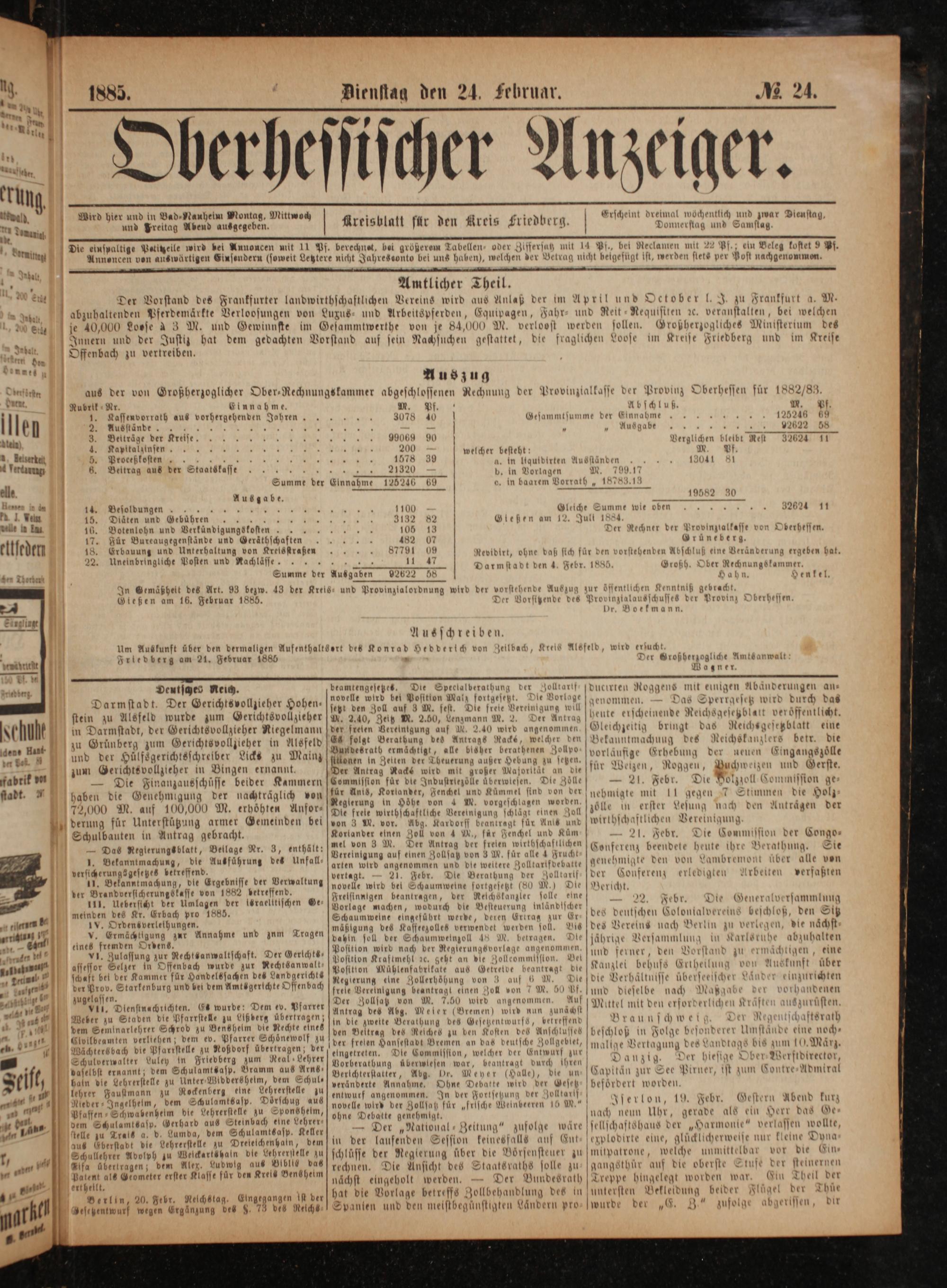 Dini aus der von Großherzoglicher Ober-Rechnungskammer abgeschlossenen Rechnung der Provinzialkasse der Provinz Oberhessen für 1882/83. 3 ö 25 0 — Rubrik Nr. Elnnahme. MW. Pf. Abschluß. M. Pf. 5* Kassenvorrath aus vorhergehenden Jahren“. 3078 40 Gesammtsumme der Einnahme 125246 69 E 5 2. Ausstände f F— N„ Ausgabe 3 92622 58 un) N 9. Beiträge, der Kreise. 99069 90 Verglichen bleibt Nest 37 4 4. Kapitalzinsen. 200 1 5 D 5 1 delterbel N geocesß 1 welcher besteht: M Pf. *— 5. Proceßkesten 1578 39 a. in liquldirten Ausständen 13041 81 A sertmug 6. Beitrag aus der Staatskasse 1 21320 b. in Vorlagen M. 799.17 N Summe der Elnnahme 125246 69 o. in bagtrem Vorrath, 1878.13 * Ausgabe. 4 19582 30 K* d 1 o 1100 Gleiche Summe wie oben 32624 11 ! Lem 1 15. Diäten und Gebühren 10 3132 82 Gleßen am 12. Juli 1884. dalle in In 14 16. Botenlohn und Verkündigungskosten 105 13 Der Rechner der Provinztalkasse von Oberhessen. elt 50 14 17. Für Bureaugegenstände und Geräthschaften 1482 O07 HA k 1 g 0 80 e liche eee 8 7* Revidirt, ohne daß sich für den vorstehenden Abschluß eine Veränderung ergeben hat. 2 25. 9*———. Darmstadt den 4. Febr. 1885. Großh. Ober Rechnungskammer. 1 Summe der Ausgaben 92622 58 Hahn. Henkel.
