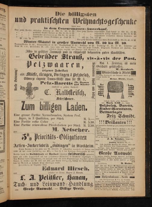 25 Rockzeuge 40 Pf., Druckzeuge 25, 30, 35 Pf., Tischtücher per 1.80, sowie rothe und bunte Kolter, rothe und weiße Damaste, Pelzpiqués, Barchente und Zwillich, blau