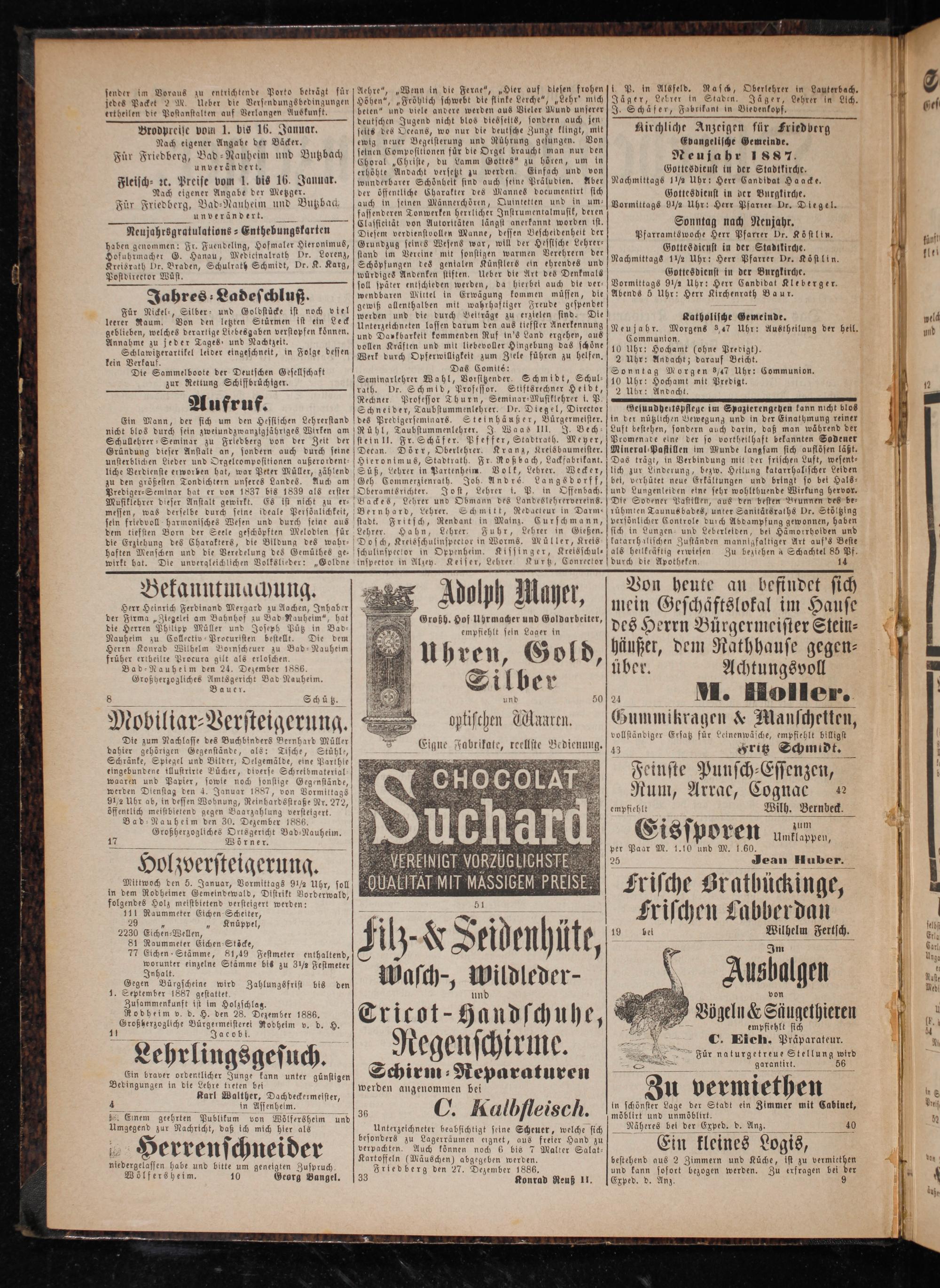 Kirchliche Anzeigen für Friedberg Ebangelische Gemeinde. Neujahr 1887. Gottesdienst in der Stadtkirche. Nachmittags 1½ Uhr: Herr Candidat Haacke.