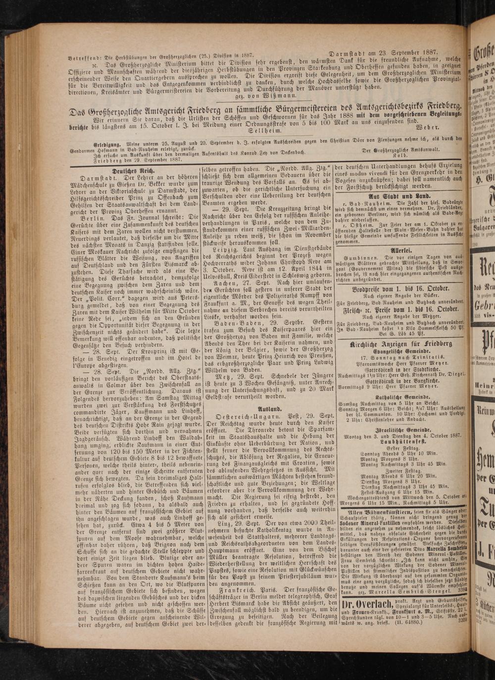 Gendarmen Hofmann in Bad Nauheim erledigt, zurück. Ich ersuche um Auskunft über den dermaligen Friedberg den 29. September 1887.