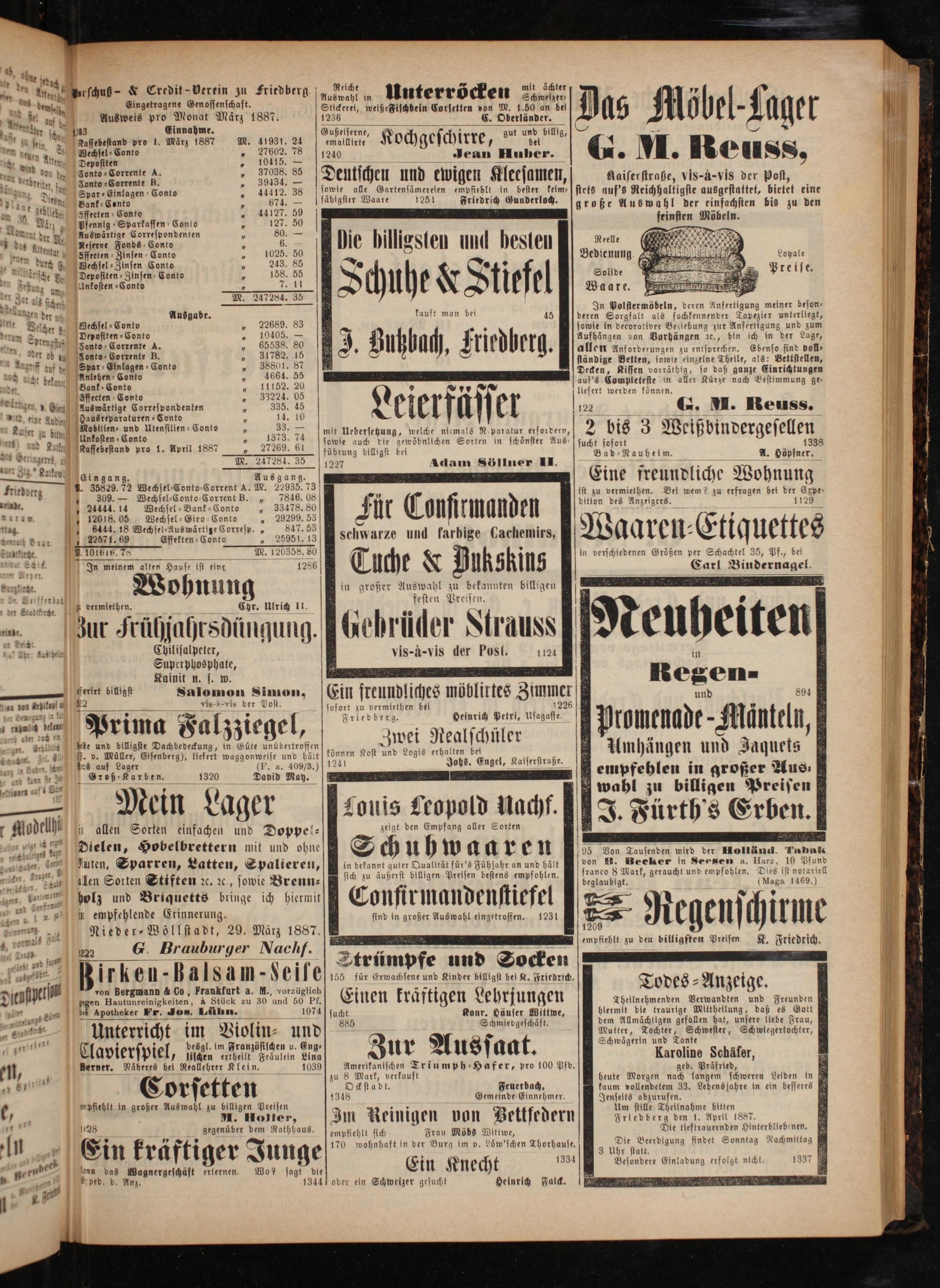 den Relche 8 mit ächter . n e rschu- N Credit e zu Friedberg. Ans wal h Unterröcken 39 Nene Eingetragene enossenschaft. 75 Stickeret, welßeßischbein Corsetten von M. 1.50 an bei 0. el auf Ausweis pro Monat Marz 1887. 1236 C. Oberländer. eert r;—— 5 N rt sc, us Einnahme. Gußelserne,(& zut und billig u en 95 Kassebestand pro 1. März 1887 M. 41931. 24 emalllirte Kochgeschirre, 57* 9, An dhe Se Nel 240 Jean Huber. St n Aten Deposite 5 5.— an een een. 39555„Deutschen und ewigen Kleesamen, 1 d fa Spar⸗Einlagen Conto 0 44412. 38 sowie alle Gartensämeresen empfiehlt in bester kelm⸗ las„n Bank ⸗Conto 5 674.— fähigster Waare 1254 Friedrich Gunderloch. bliebe, Iffeeten Conte„44127. 59 * Nan Pfennig»Sparkassen Conto. 127. 50 tnt der y Auswärtige Correspondenten 2 80.— pilli a ee 1 ee ce Ae Lesens Pede Gente 3 Die billigsten und besten fene Wente Sffecten Zinsen Conto 5 1025. 50 0 durch g, Wechsel⸗Zinsen Conto 5 243. 85 2 214 sche Je, Depositen⸗Zinsen Conto 4 158. 55 edung a, Ankosten⸗Conto 8 7. 11 r als ien M. 247284. 35 2 münnden der 1 Ausgabe. kauft man bei nete. Welcher 5 Wechsel⸗Conto 22689. 83 derm Sur, l Depositen⸗Conto 10405.— the Optenpftoß Fonto⸗ Corrente A.„ 65538. 80 J. gubba, Klicdberg * ob a Fonto⸗Corrente B. 6 greff zuf de Spar⸗Einlagen⸗Conto„ 38801. 87 9 nicht beka Anlehen⸗Conto 3 4664. 55 tudet Bank- Conto n ** Effecten Conto l een,. Glen. Auswärtige Correspondenten 7 335. 45 eier fi Ex d eint Aude, Haus reparaturen⸗Conto f 14. 10 e Kaftt zu bitt—.— und Utensillen Conto„ 1 74 mit Uebersetzung, welche niemals Ruparatur erfordern, ttt N Kalke Unkosten⸗Conto 1. 43 sowie auch die gewöbnlichen Sorten in schönster Aus I Ale Kassebestand pro 1. April 1887 27269. 61 führung billigst bel —* f e Adam Söllner II. nmgzéisgang. Ausgang. fritdott J. 35829. 72 Wechsel⸗Conto⸗Corrent A. M. 22935. 73 8 90 309.— Wechsel⸗Conto⸗Corrent B.„ 7846. 08 2 ed. 2444.14 Wechsel⸗Bank⸗Conto„ 33478. 80 II In Aman El 11. 12018. 05 Wechsel⸗Giro Conto„ 29299. 53 nag. 6444. 18 Auswärtige Corresp., 847. 53 n. e 2874„ ekter Gente 2881,13 schwarze und farbige Cachemirs, Subtlirtke 101516. 75 85 M. 120358. 80 Sie In meinem alten Hause sst eine 1286 U kł N 1 U U Ins ertzhirtt. Wohnung in großer Auswahl zu bekannten billigen g r— b vermlethen. Chr. Ulrich II. g 2 5 ö Zur Jrühjahrsdi Gebrüder Strauss! 1 ur Jrühjahrsdüngung. 6 T Strauss „ A, 4480 Chilisalpeter, vis-à-vis der Post. 1124 Superphosphate,