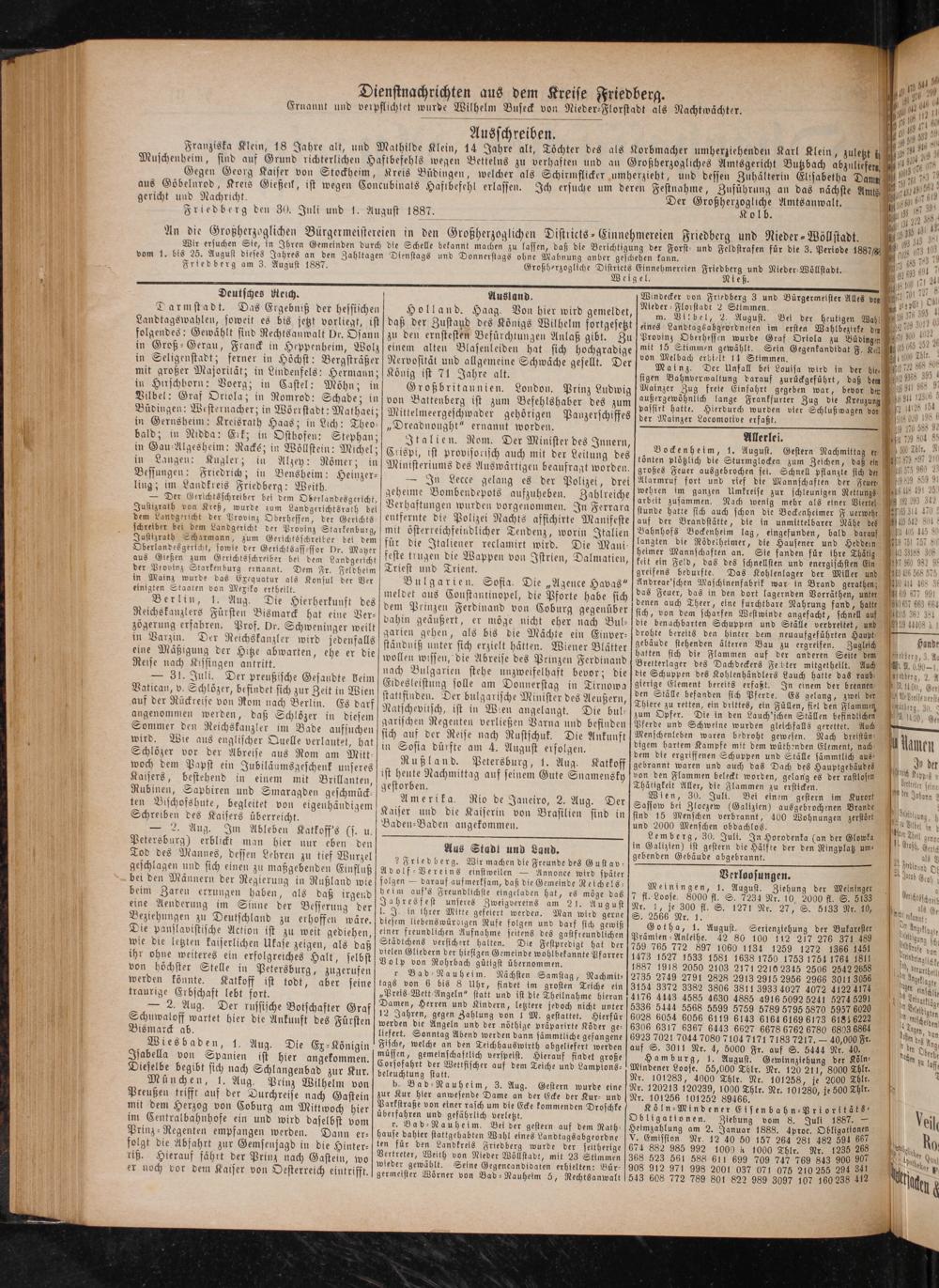 Bulgarien. Sofia. Die„Agence Havas“ meldet aus Constantinopel, die Pforte habe sich dem Prinzen Ferdinand von Coburg gegenüber dahin geäußert, er möge nicht eher nach Bul— garien gehen, als bis die Mächte ein Einver— ständniß unter sich erzielt hätten. Wiener Blätter wollen wissen, die Abreise des Prinzen Ferdinand nach Bulgarien stehe unzweifelhaft bevor; die Eidesleistung solle am Donnerstag in Tirnowa stattfinden. Der bulgarische Minister des Aeußern, Natschevitsch, ist in Wien angelangt. Die bul— garischen Regenten verließen Varna und befinden sich auf der Reise nach Rustschuk. Die Ankunft in Sosia dürfte am 4. August erfolgen.