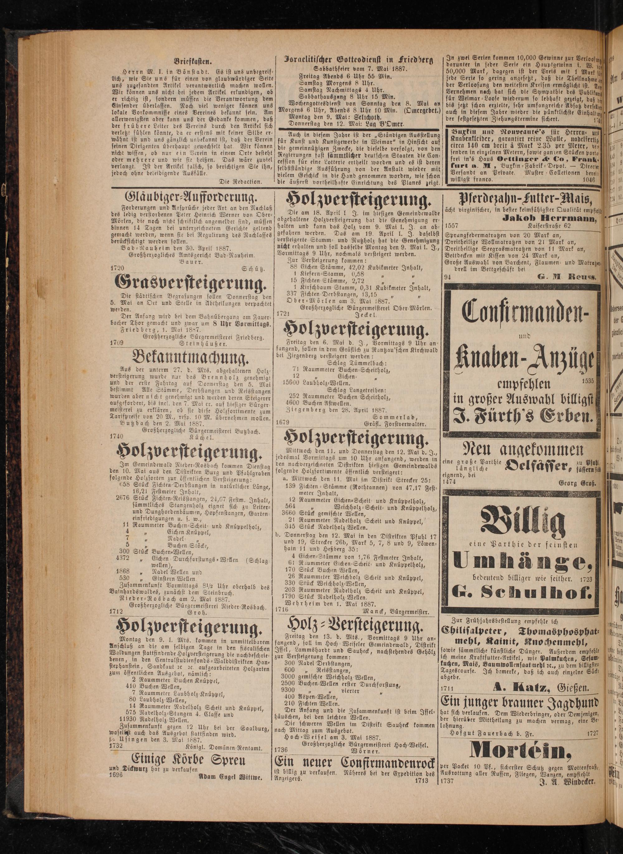 Jsraelitischer Gottesdienst in Friedberg Sabbathfeier vom 7. Mat 1887. Freltag Abends 6 Uhr 55 Min. Samstag Morgens 8 Uhr. Samstag Nachmittags 4 Uhr. Sabbathausgang 8 Uhr 15 Min. Wochengottesdlenst von Sonntag den 8. Mal an Morgens 6 Uhr, Abends 8 Uhr 10 Min.(Omergebet.) Montag den 9. Mal: Selichoth. Donnerstag den 12. Mai: Lag B' Omer.