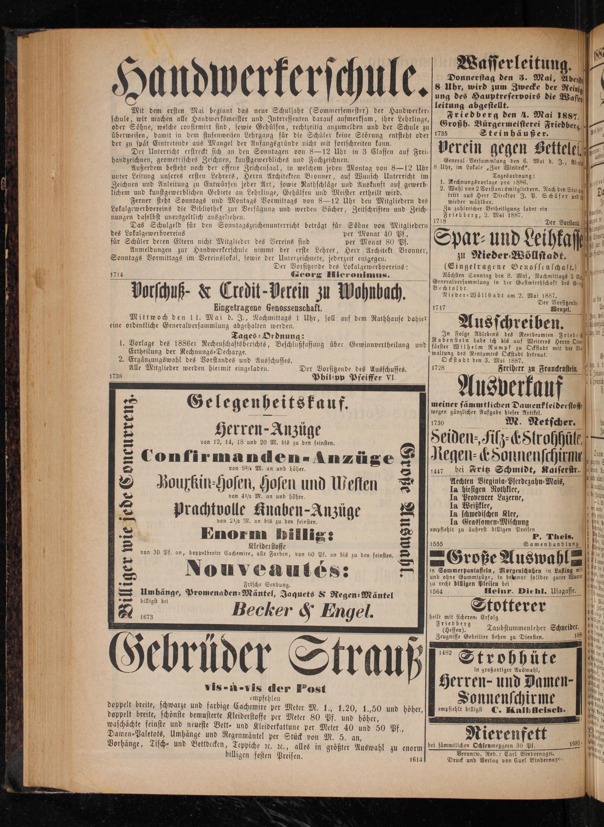 tritt aus Herr Direktor J. P. Schäfer und i wieder wählbar. Zu zahlreicher Bethetligung ladet ein Friedberg, 2. Mai 1887. 1718 Der Vorstauz