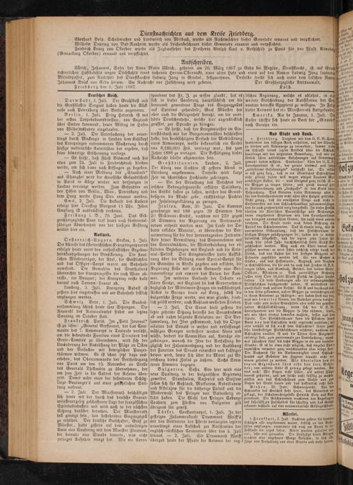 Dienstnachrichten aus dem Kreise Friedberg. Eberhard Volp, Schuhmacher und Landwirth von Melbach, wurde als Nachtwächter dieser Gemeinde ernannt und verpflichtet. Wilhelm Deuring von Bad-Nauheim wurde als Leichenbeschauer dieser Gemeinde ernannt und verpflichtet. ‚ Friedrich Kranz von Okarben wurde als Jagdaufseher des Freiherrn Adolph Carl v. Rothschild zu Paris für den Wald Alten beg (Gemarkung Okarben) ernannt und verpflichtet.