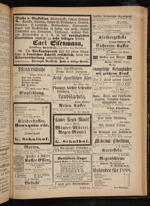 Friedberg, Kaiserstraße, gegenüber dem Rathhause. NB. Die Verkaufspreise sind bei jedem Gegen— stand in deutlicher Schrift ersichtlich, sodaß eine Uebervortheilung ausgeschlossen ist. 2700 Geschäftsprincip: Streugste Reellität. Feste u. billige Preise.