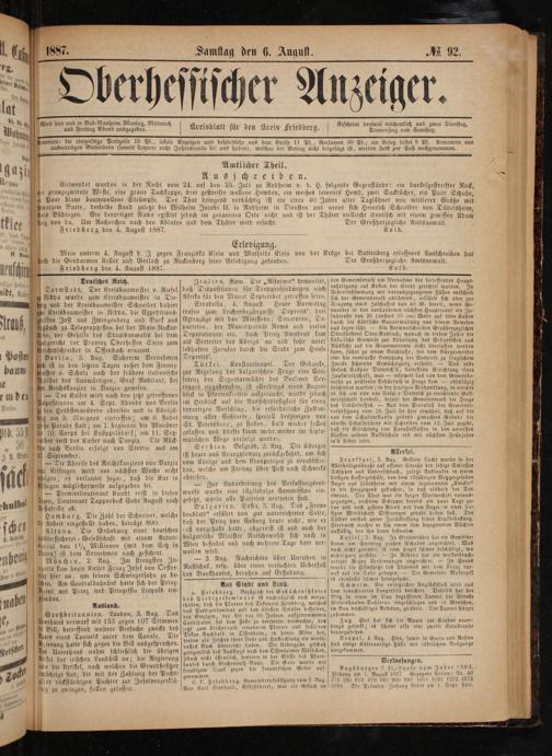 un Kreisbaumeister in Nidda, die Expeditions— Pilfen Jost aus Zwingenberg und Burk aus Atzbach zu Telegraphisten bei der Main-Neckar— Ahn, der Gehilfe des Staatsanwalts bei dem Jdgericht der Provinz Oberhessen Stein zum Hrichtsschreiber in Offenbach ernannt. Berlin, 3. Aug. Sicherem Vernehmen 00 ist in den letzten Tagen außer dem Finanz— ter v. Scholz auch der frühere italienische nister des Auswärtigen, Graf Robilant, bei Reichskanzler in Varzin gewesen. — Der Kaiser wird nach den jetzt getroffenen Jspositionen am 4. Sept. Abends von Berlin zu den Herbstmanövern abreisen und in Königs— Iieg am 5. Morgens eintreffen; am 6. findet aße Parade statt; am 7. beginnen die Manöver e 10. Corps bei Knöppelsdorf; am 11. Sep ben ber reist der Kaiser nach Danzig. Die Rück— kar nach Berlin erfolgt von Stettin aus am September. 9— Die Abreise des Reichskanzlers von Varzin gh Kissingen wird vor nächster Woche nicht olgen; es verlautet sogar, daß die Kur in singen möglicherweise aufgegeben sei. — Premierlieutenant Kundt reist in diesen Agen, Lieutenant Tappenbeck Ende August nach Bstafrika ab.