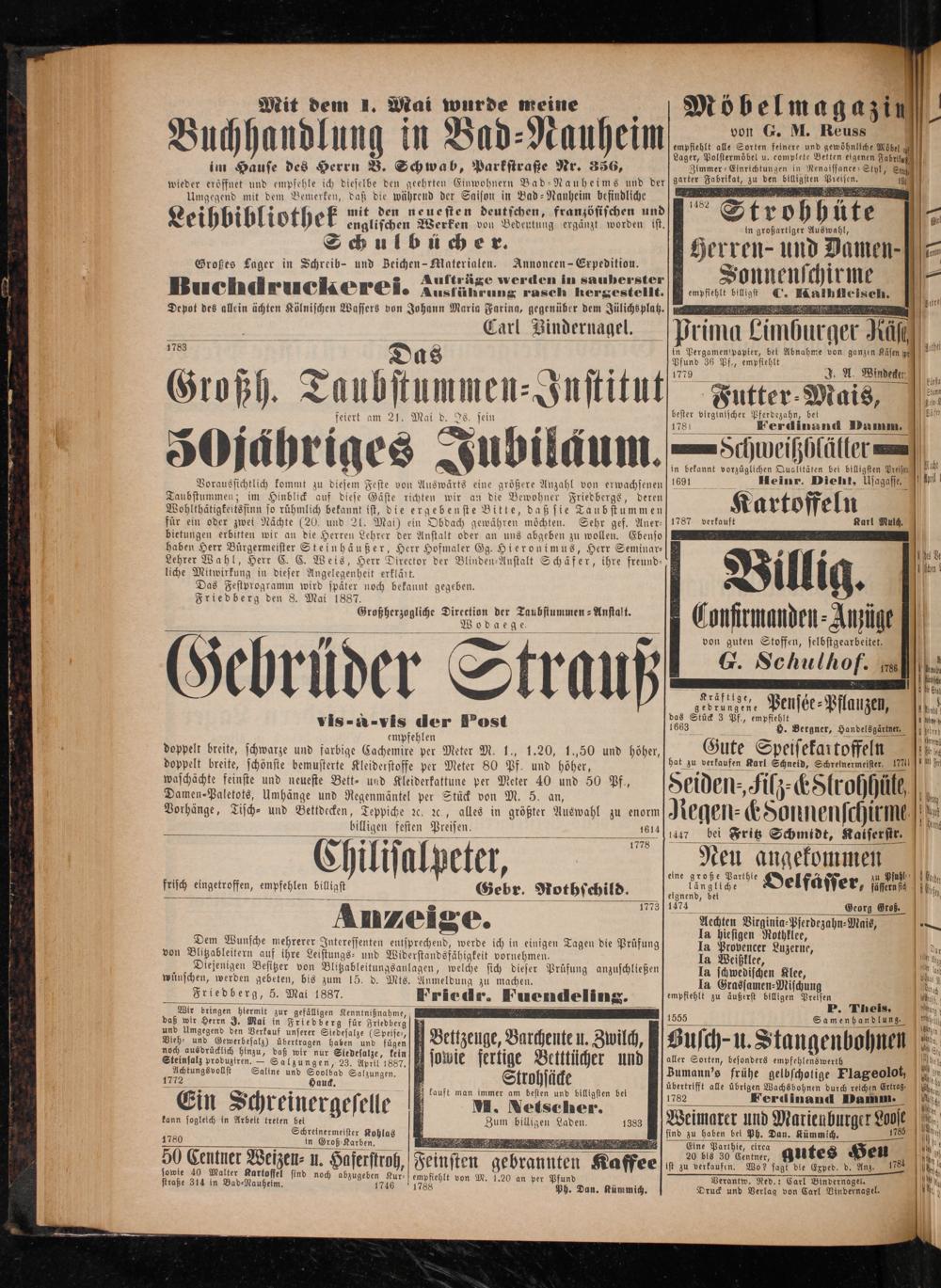 Friedberg, 5. Mai 1887. Friedr. Fuendeling. Wir bringen hiermit zur gefälligen menntnißnahme, RS rr e e uc, Vieh⸗ 15 Gewerbesalz) 8. 5 Bettzeuge, Barchente U. Zwilch, I sowie fertige Betttücher und