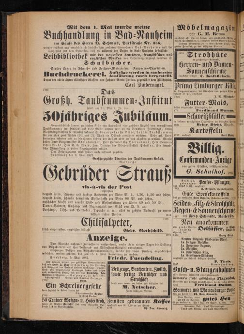 liche Mitwirkung in dieser Angelegenheit erklärt. Das Festprogramm wird spaͤter noch bekannt gegeben. Friedberg den 8. Mai 1887. Großherzogliche Direction der Taubstummen⸗Anstalt. Wodaege.