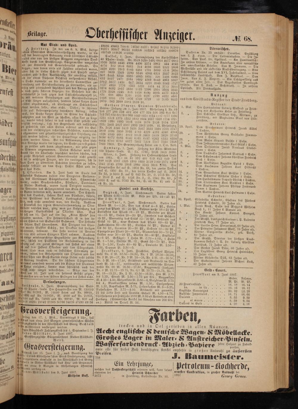 ßen zu lassen, 2542 2745 2780 mehr festhält an dem Satz: Prüfet Alles und be— Haupttreffer fiel au 1950 Nr. 66, der zweite Treffer blet das Beste. 5 i 5, der dritte Treffer auf 3606 „ Okarben. Am 5. Juni fand im Saale des auf S 643 Nr. 20, Astwirths Baßmann dahier eine Delegirten-Versamm-[f 5, S. a des Wetterauer Sängerbundes statt. Sämmtliche Weine, außer Bruchenbrücken, 38 Dortelwell 44 Nr. 55. Nieder Rosbach, waren durch Delegirte vertreten. 7 ö h Vertreter des Gesangvcreins von Klein Karben, der 0 Hendel und Verkehr. de Bunde beitreten will, waren anwesend. Der Schrist. Bußbach, 8. Juni. Wochenmarkt. Butter kostete her des Bundes, Lehrer Volk von Bönstadt, führte, per Pfund 0.95—0.00 M. Käse per Pfb. 4445 Pf. der Präsident des Bundes, Landtagsabgeord neter Eier 2 St. 9 Pf. i 8 5 Ueb, noch nicht anwesend war, den Vorsitz. Nachdem ite Juni. Wochenmarkt. Butter das Protokoll der letzten Generalversammlung zu Ober- Pfund M. 1—1.20, N Stück 4—6 f., Erbsen stadt verlesen war, ging man zur Besprechung des ganze das Pfund 16. 20 Pf., Vohnen weiße 16—22 Pf., Mfährigen Bundesfestes zu Okarben über. Das Kartoffeln das Pfund 16118 Pf.“ Malteser per Pfund f soll am 10. Juli auf der sog.„Alten Wiese“ hier 14—15 Pf., Linsen 20—30 f,, Zwiebeln das Gescheid lanze Foalten werden. Die Festwirthschaft ist in den be⸗ 15 Pf, Meerrettig das Stuck 25 20 Pf, Kohlrabi das a okten Händen des Gastwirths Baßmann. Die Festrede Stück 10 Pf., neue Bohnen das Pfund 60-65 Pf., f Lehrer Volk übernehmen. Als Dirigent des Chor— Zuckerschoten 60—80 Pf., Kirschen 50 Pf., Spinat 4⁰ 3 wurde Musiker Schütz, der Direktor des hlesigen bis 50 Pf., Carolten 20 000 Pf., Sellerie 10290 Pf., ereins, bestimmt. Am Feste werden 14 Vereine Spargeln per Pfund 20-60 Pf, Blumenkohl 5070 Wf., rea 400 activen Sängern Theil nehmen. Nachdem Erbsen neue 30—40 Pf., Ourken e Kopfsalat oh einige minderwichtige Gegenstände zur Besprechung 4—6 Pf. Geflügel: 5955 M. 0.7919 0 1 Huhn 4 Präsi Ver 5 0 tk. 1—2.5 Welse M.*—7 5 an„ schloß der Präsident die Versammlung in der M. 1 2 50, Welsche 12 Gans 50 e 5288 Fung auf ein gutes Gelingen des Festes mit einem M. 22.50, e Pf., Poularde M. 2.50— auf den Festort Okarben und den Sängerbund. 3.50, Capaun e eee e 1 ann blieb man noch in fröhlicher Stimmung zu⸗ Frankfurt, 9. Juni.„Frucht er. JSesiges Weizen⸗ ien, indem der Gesangverein von Okarben und ver mehl Nr. 0. f Nr. 50 M. 150 3 1 dichte Chor von Groß⸗Karben einige Lieder recht hübsch Nr. 2 M. 26—2 7, Nr. 3 M. 5 W 5.„ 10 Vortrag brachten. Da die schönen Sängerinnen Nr. 5 M. 16— 17.50, Milchbrod- und Brodmehl im Ver⸗ ö einmal anwesend waren und die Klänge des Pianinos band M. 54— 57, norddeutsche und westfälische Weizen⸗ „ 4h ee Tanze einluden, konnte man schließlich auch der mehle Nr. 00 M. e Roggenmehl(hiesiges) laden] aß nicht länger widerstehen.— Möge nur der Nr. 0 M. 22.75— 23 e e. 20.75— 21.75, Nr.! puhlade Aae am 10. Juli uns ein heiteres Gesicht zeigen; M. e e 1 5 biete me fl i schõ a 8 N 8 3.2 roh M. 2.50— 2.75 per Ctr., Roggenklei Aalen wir an dem schönen Gelingen das estes 3 3 254.50, Wezenklele W. 3.50—4, Malztelme M. 3.75 Verloosungen. bis 4, Woostorfstren prima M. 1.30, Spelzenspaeu 4 arlsruhe, 1. Juni. Gewinnzlehung der Babt⸗ M. N, Rapskuchen M. 5.75, Sesamkuchen M. 55.25, 0⁰ Thaler ⸗Loose. Der Haupttreffer von M. 120000 Mohnkuchen M. 3.75—4.00. Relsmehl mit„garantir, f Nr. 81383, M. 24000 fielen auf Nr. 998014, 22 bis 24% Fett und Protein, Gehalt M. 4.50—4.75, „000 auf Nr. 111638, M. 4800 auf Nr. 21833, Chilisalpeter per Frühjahr 1888 m. 880 aß Rotterdem oder „00 auf Nr. 74865 und Nr. 99848, M. 600 auf Harburg.(Sämmtliche Artikel bei Abnahme von 200 Ctr.