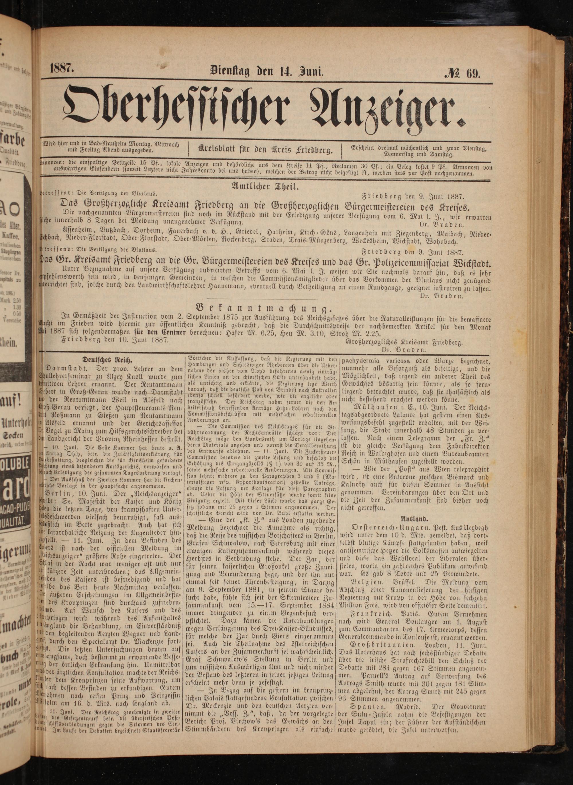 ee Dr. Braden. Langenhain mit Ziegenberg, Maibach, Nieder⸗ Wickstadt, Wohnbach. Friedberg den 9. Juni 1887.