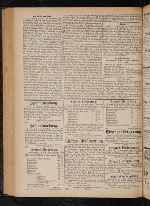 fangend, soll das der hiesigen Gemeinde zustehende 8 gras auf dem Gemeindehaus in Abtheilungen meist bete versteigert werden. Faauerbach b. Fr. am 11. Juni 1887.