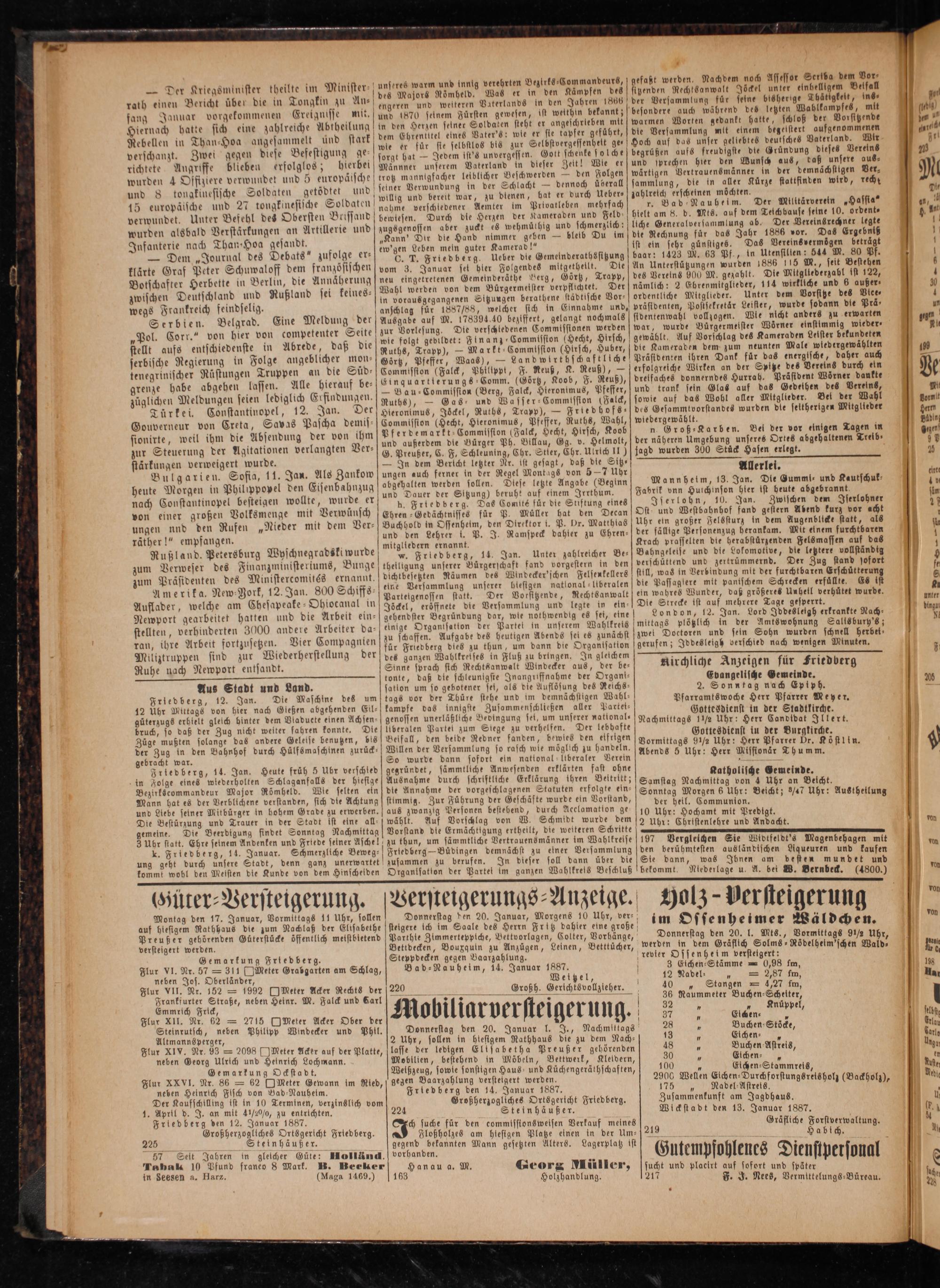 220 0**——* 1 Mobiliarversteigerung. Donnerstag den 20. Januar l. J., Nachmittags 2 Uhr, sollen in hiesigem Rathhaus die zu dem Nach— lasse der ledigen Elisabetha Preußer gehörenden Mobilien, bestehend in Möbeln, Bettwerk, Kleidern, Welßzeug, sowie sonstigen Haus- und Küchengeräthschaften, gegen Baarzahlung versteigert werden. Friedberg den 14. Januar 1887. Großherzogliches Ortsgericht Friedberg. 224 Stein häußer. ch suche für den commisstonsweisen Verkauf meines Floßholzes am hiesigen Platze einen in der Um— gegend bekannten Mann gesetzten Alters. Lagerplatz ist