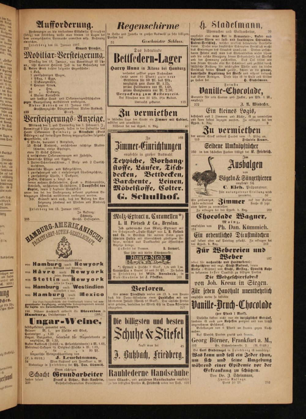 Forderungen an die verstorbene Ellsabetha Preußer (ledig) von Friedberg wolle man binnen 10 Tagen bet dem unterzeichneten Vormunde anmelden resp. Rechnung eln reichen. eien den 14. Januar 1887.
