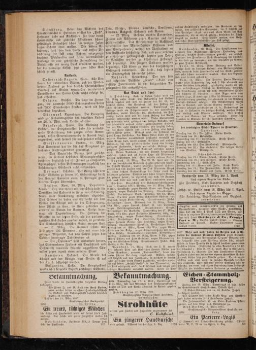 Gießen. Verzeichniß der Schwurgerschtssitzungen vom 1. Quartal 1887: Montag den 14. März, Vorm. 9 Uhr, Strafsache gegen Conrad Sann von Burg-Ge— münden, wegen Versuchs der Tödtung. Staatsanwalt:
