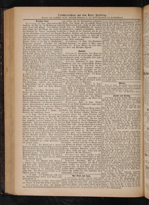 Friedberg, 10. Sept. Fruchtpr. Walzen M. 16.50, Korn M. 13.00, Gerste M. 14.00- 15.50, Hafer M. 12. Alle Preise verstehen sich auf 100 Kilo= 200 Zollpfd.