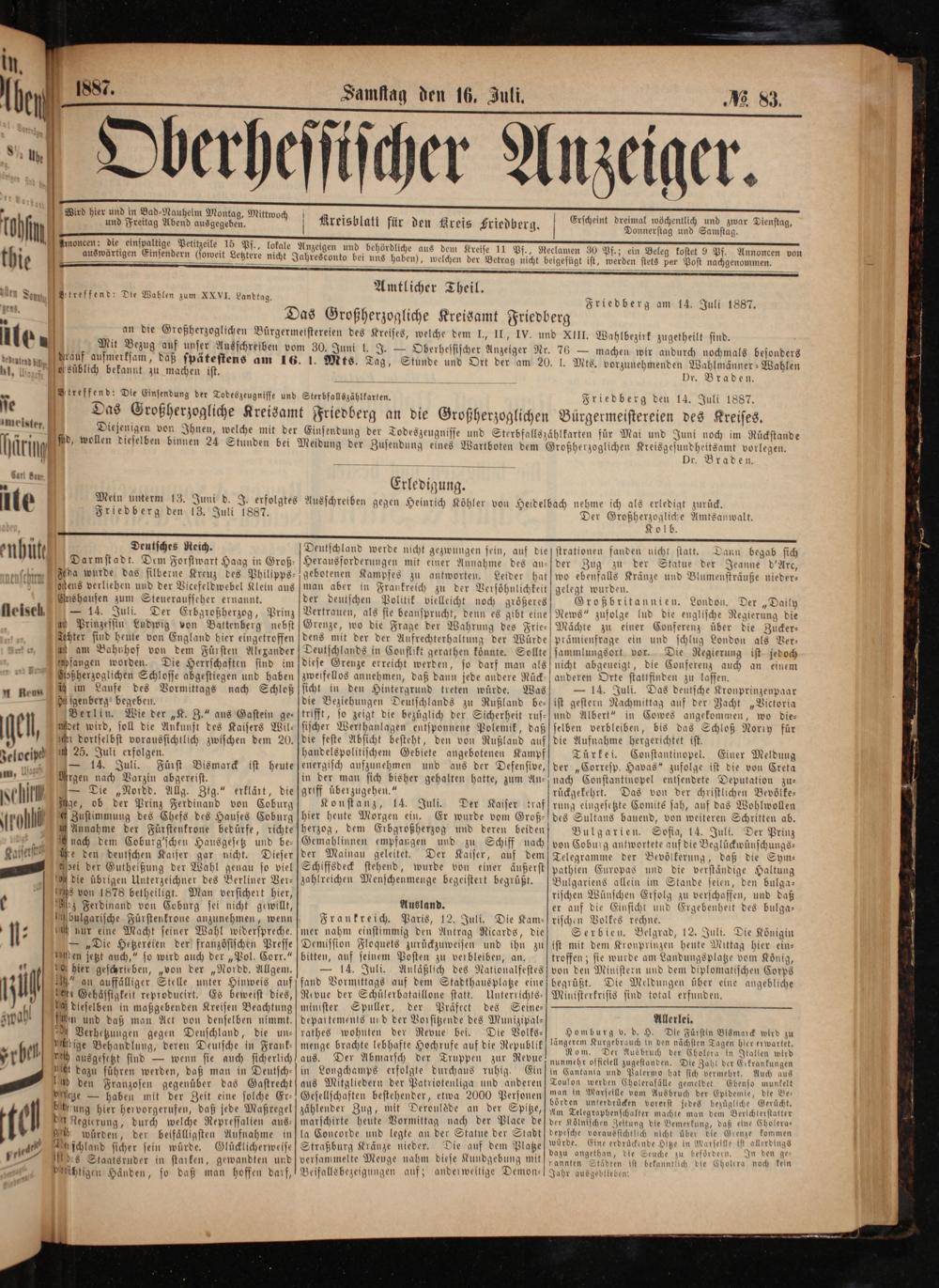 Dr. Braden. Friedberg den 14. Juli 1887. Bürgermeistereien des Kreises.