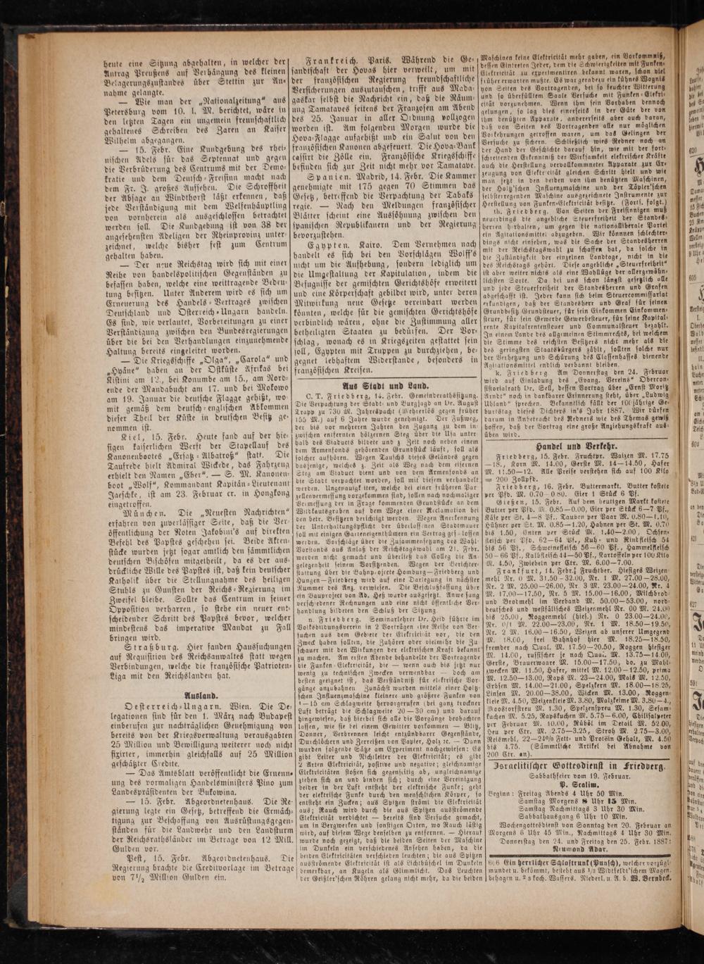 IJsraelitischer Gottesdienst in Friedberg. Sabbathfeier vom 19. Februar. P. Scalim. Beginn: Freitag Abends 4 Uhr 50 Min. Samstag Morgens 8 Uhr 15 Min. Samstag Nachmittags 3 Uhr 30 Min. Sabbathausgang 6 Uhr 10 Min. 4 Wochengottes dienst von Sonntag den 20. Februar an Morgens 6 Uhr 45 Min., Nachmittags 4 Uhr 30 Min. Donnerstag den 24. und Freitag den 25. Febr. 1887:— Neumond Adar. 5