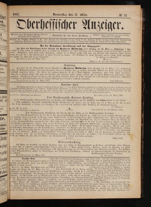 1 N 1 Innoncen: die einspaltige Petitzeile 15 Pf., lokale Anzeigen und behördliche aus dem Kreise 11 Pf., Reclamen 30 Pf.; ein Beleg kostet 9 Pf. Annoncen von det auswärtigen Einsendern(soweit Letztere nicht Jahresconto bei uns haben), welchen der Betrag nicht beigefügt ist, werden stets per Post nachgenommen. „ An die Bewohner Friedbergs und der Umgegend! 0 Zur Feier des Geburtstages Seiner Majestät des Kalsers Wilnelm fiadet Dienstag den 22. März c., Nachmittags 1 Uhr, * n Hotel Trapp dahier ein Festmahl statt, zu welchem die Bewohner der Stadt Friedberg und der Umgegend hierdurch freundlichst eingeladen 0 verden. Auswaͤrtige, sowie solche hiesige Einwohner, welchen die in Umlauf gesetzte Liste etwa aus Versehen nicht zukommen sollte, werden 1 erbeten bis zum 20. c. ihre Anmeldungen im Hötel Trapp zu machen. Die Bewohner der Stadt Friedberg werden ersucht, durch Schmücken Wirtin, drer Häuser zur Feier des Tages mitzuwirken. In Auftrag des Comits's: * Greg Friedberg den 14. Marz 1887. Winter, 4 12** 1 Major z. D. und Bezirks⸗Commandeur. 97 5 berei un Einladung.