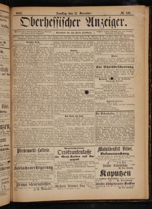 haussaale statt. Erwachsene zahlen, 20 Pf., 4 Kinder 10 Pf. Eintrittsgeld. 8 Kirchliche Algen für Friedberg Evangelische Gemeinde. 4. Advent. 3 Pfarramtswoche Herr Pfarrer Meyer. Gottesdienst in der Stadtkirche. Nachmittags 1¼ Uhr: Herr Candidat Weinberger. Gottesdienst in der Burgkirche. Vormittags 912 Uhr: Herr Kirchenrath Baur. Abends 5 Uhr: Herr Pfarrer Dr. Köstlin. Am zweiten Weihnachtsfesttag Abendmahl in der Burgkirche, Beichte nach dem Vormittagsgottesdienst des ersten Festtags satholische Gemeinde. Samstag von 4 Uhr an Beicht. Sonntag Morgen 6 Uhr: Beicht; 8/47 Uhr: Austheilung der hl. Communion. J 10 Uhr: Hochamt und Predigt. l