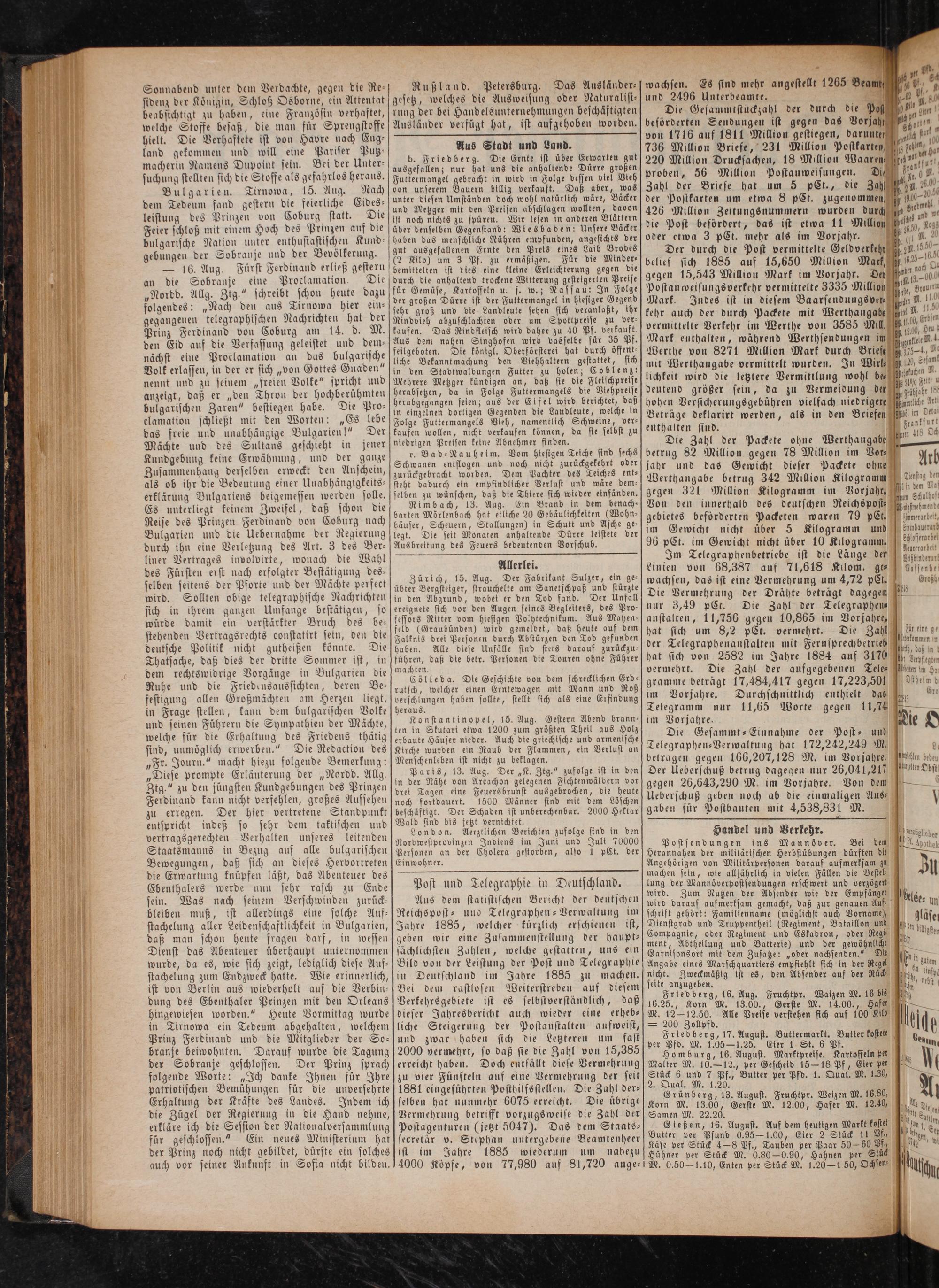 Sonnabend unter dem Verdachte, gegen die Re— sidenz der Königin, Schloß Osborne, ein Attentat beabsichtigt zu haben, eine Französin verhaftet, welche Stoffe besaß, die man für Sprengstoffe hielt. Die Verhaftete ist von Havre nach Eng— land gekommen und will eine Pariser Putz— macherin Namens Dupoint sein. Bei der Unter suchung stellten sich die Stoffe als gefahrlos heraus. Bulgarien. Tirnowa, 15. Aug. Nach dem Tedeum fand gestern die feierliche Eides— leistung des Prinzen von Coburg statt. Die Feier schloß mit einem Hoch des Prinzen auf die bulgarische Nation unter enthustastischen Kund— gebungen der Sobranje und der Bevölkerung. — 16. Aug. Fürst Ferdinand erließ gestern an die Sobranje eine Proclamation. Die „Nordd. Allg. Ztg.“ schreibt schon heute dazu folgendes:„Nach den aus Tirnowa hier ein⸗ gegangenen telegraphischen Nachrichten hat der Prinz Ferdinand von Coburg am 14. d. M. den Eid auf die Verfassung geleistet und dem— nächst eine Proclamation an das bulgarische Volk erlassen, in der er sich„von Gottes Gnaden“ nennt und zu seinem„freien Volke“ spricht und anzeigt, daß er„den Thron der hochberühmten bulgarischen Zaren“ bestiegen habe. Die Pro— clamation schließt mit den Worten:„Es lebe das freie und unabhängige Bulgarien!“ Der Mächte und des Sultans geschieht in jener Kundgebung keine Erwähnung, und der ganze Zusammenhang derselben erweckt den Anschein, als ob ihr die Bedeutung einer Unabhängigkeits— erklärung Bulgariens beigemessen werden solle. Es unterliegt keinem Zweifel, daß schon die Reise des Prinzen Ferdinand von Coburg nach Bulgarien und die Uebernahme der Regierung durch ihn eine Verletzung des Art. 3 des Ber— liner Vertrages involvirte, wonach die Wahl des Fürsten erst nach erfolgter Bestätigung des— selben seitens der Pforte und der Mächte perfect wird. Sollten obige telegraphische Nachrichten sich in ihrem ganzen Umfange bestätigen, so würde damit ein verstärkter Bruch des be— stehenden Vertragsrechts constatirt sein, den die deutsche Politik nicht gutheißen könnte. Die Thatsache, daß dies der dritte Sommer ist, in dem rechtswidrige Vorgänge in Bulgarien die Ruhe und die Friedensaussichten, deren Be— festigung allen Großmächten am Herzen liegt, in Frage stellen, kann dem bulgarischen Volke und seinen Führern die Sympathien der Mächte, welche für die Erhaltung des Friedens thätig sind, unmöglich erwerben.“ Die Redaction des „Fr. Journ.“ macht hiezu folgende Bemerkung: „Diese prompte Erläuterung der„Nordd. Allg. Ztg.“ zu den jüngsten Kundgebungen des Prinzen Ferdinand kann nicht verfehlen, großes Aufsehen zu erregen. Der hier vertretene Standpunkt entspricht indeß so sehr dem taktischen und vertragsgerechten Verhalten unseres leitenden Staatsmanns in Bezug auf alle bulgarischen Bewegungen, daß sich an dieses Hervortreten die Erwartung knüpfen läßt, das Abenteuer des Ebenthalers werde nun sehr rasch zu Ende sein. Was nach seinem Verschwinden zurück— bleiben muß, ist allerdings eine solche Auf— stachelung aller Leidenschaftlichkeit in Bulgarien, daß man schon heute fragen darf, in wessen Dienst das Abenteuer überhaupt unternommen wurde, da es, wie sich zeigt, lediglich diese Auf— stachelung zum Endzweck hatte. Wie erinnerlich, ist von Berlin aus wiederholt auf die Verbin— dung des Ebenthaler Prinzen mit den Orleans hingewiesen worden.“ Heute Vormittag wurde in Tirnowa ein Tedeum abgehalten, welchem Prinz Ferdinand und die Mitglieder der So— branje beiwohnten. Darauf wurde die Tagung der Sobranje geschlossen. Der Prinz sprach folgende Worte:„Ich danke Ihnen für Ihre patriotischen Bemühungen für die unversehrte Erhaltung der Kräfte des Landes. Indem ich die Zügel der Regierung in die Hand nehme, erkläre ich die Session der Nationalversammlung für geschlossen.“ Ein neues Ministerium hat der Prinz noch nicht gebildet, dürfte ein solches auch vor seiner Ankunft in Sofia nicht bilden.