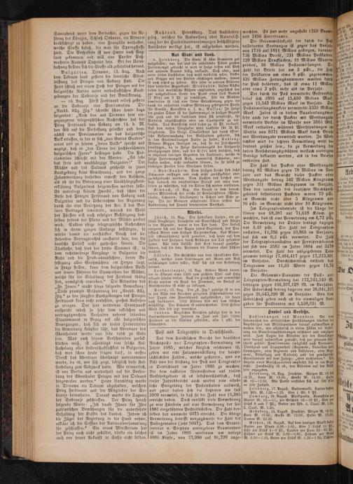 Aus dem statistischen Bericht der deutschen Reichspost- und Telegraphen-Verwaltung im Jahre 1885, welcher kuͤrzlich erschienen ist, geben wir eine Zusammenstellung der haupt— sächlichsten Zahlen, welche gestatten, uns ein Bild von der Leistung der Post und Telegraphie in Deutschland im Jahre 1885 zu machen. Bei dem rastlosen Weiterstreben auf diesem Verkehrs gebiete ist es selbstverständlich, daß dieser Jahresbericht auch wieder eine erheb— liche Steigerung der Postanstalten aufweist, und zwar haben sich die Letzteren um fast 2000 vermehrt, so daß sie die Zahl von 15,385 erreicht haben. Doch entfällt diese Vermehrung zu vier Fuͤnfteln auf eine Vermehrung der seit 1881 eingeführten Posthilfsstellen. Die Zahl der— selben hat nunmehr 6075 erreicht. Die übrige Vermehrung betrifft vorzugsweise die Zahl der Postagenturen(jetzt 5047). Das dem Staats— secretaͤr v. Stephan untergebene Beamtenheer ist im Jahre 1885 wiederum um nahezu 4000 Köpfe, von 77,980 auf 81,720 ange—