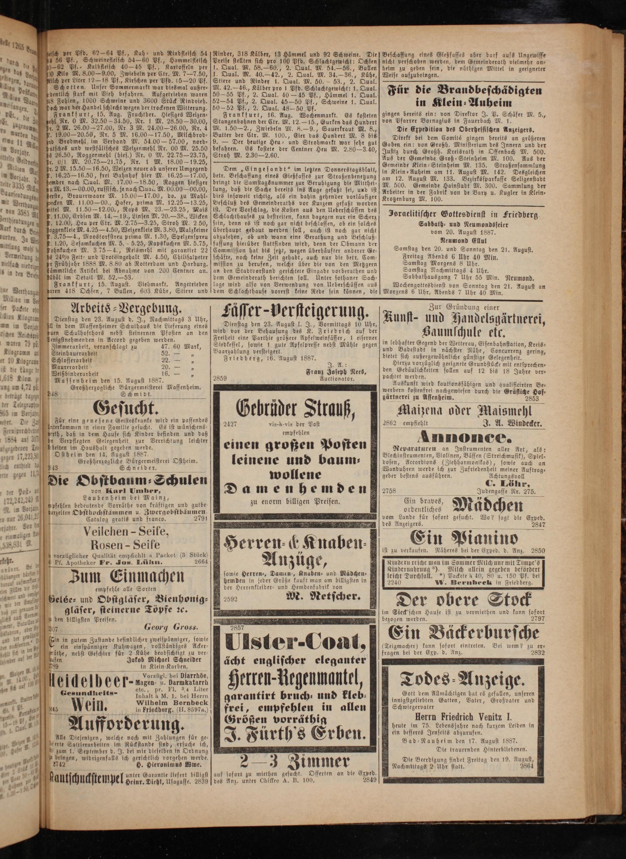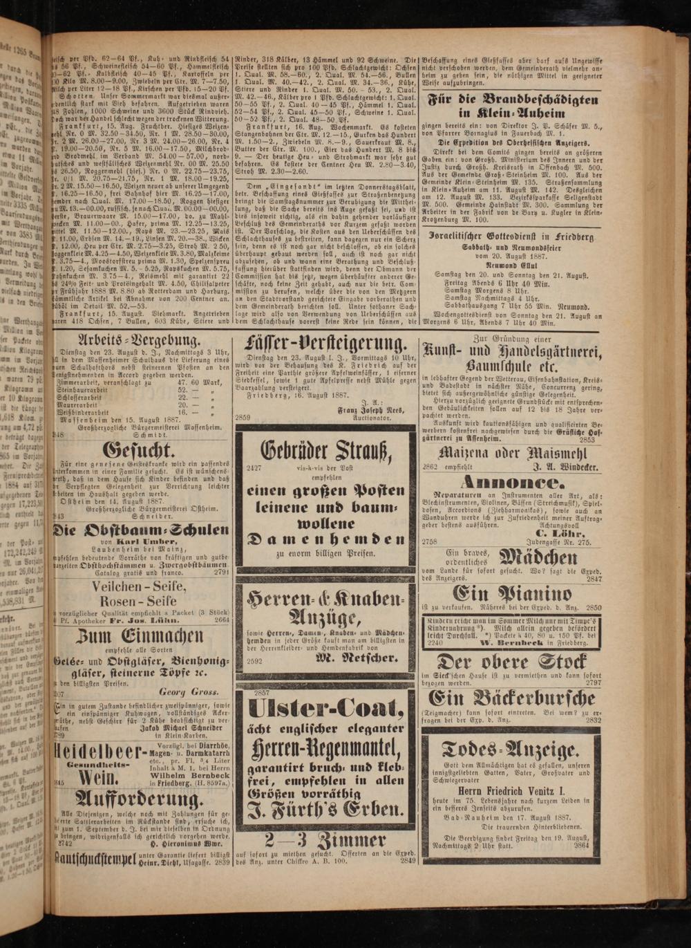 buen Schulhofthors nebst steinernen Pfosten an den wird vor der Behausung des K. Friedrich auf der Baumschule etc. Tatesnebwenden in Accord gegeben werden. Freiheit eine Parthie größere Apfelweinfässer, 1 eiserner Zimmerarbeit, veranschlagt zu 47. 60 Mark Siedkessel, sowle 1 gute Apfelpresse nebst Mühle gegen] in lebhafter Gegend der Wetterau, Eisenbahnstation, Kreis Steinhauerarbeit 8. b Baarzahlung versteigert. und Badestadt in nächster Nähe, Coneurrenz gering, Schlosserarbelt 8 Friedberg, 16. August 1887. bietet sich außergewöhnliche zünstige Gelegenheit. Maurerarbeit 20. 5. 38 Hierzu vorzüglich geeignete Grundstücke mit entsprechen⸗ Weißbinderarbeit 3 Franz Joseph Nees, 77 Gebäulichkeiten sollen auf 12 bis 18 Jahre ver⸗ a Massenheim den 15. August 1887. N 2859 Auctlonator. 7 55— 5 d kauttonsfähi 15 J 3 8 uskunft wird kautkonsfähigen und qualificirten Be⸗ 8 5 8 ³˙ A K b g. Großherzogliche Aer Massenheim werbern kostenfrei nachgewiesen durch die Orüsliche Hof⸗ trägt dagezas Bae 6 S*. 25 gärtnerei zu Assenheim. 2853 ' tlegrapbe g 4 i 5 8 on; 2525 Gesucht. Geblüder Strauß, Maizena oder Maismehl Die Za Für eine genesene Geisteskranke wird ein passendes 5 1 2862 855 6: res e nterkommen in einer Familie gesucht. Es ist wünschens 24 en 3 Post 3 J. A. Windecker. eta] zerth, daß in dem Hause sich Kinder befinden und daß empfehlen A N ee e er Verpflegten Gelegenheit zur Verrichtung leichter ei ien r ßen Po sten 4 IDhDohnhee 2 gegebenen Tah 1 7 een 1 1 98 0 a 5 ö Reparaturen an Instrumenten aller Art, als: 7235 1 thelm en 14. August 1887. 1 1 Blechinstrumenten, Violinen, Bässen(Streichmusik), Spiel⸗ — 1 43 Rn Ostheim. leinene und baum⸗ dosen, Accordions(Ziehharmonikas), sowie auch an taihien in e W ve Aukr 50 8 4*—.) 2 0 5 43 hneider Wanduhren werde ich zur Zufriedenheit meiner Auftrag⸗ gegen II wollene geber bestens ausführen. Achtungsvoll 8 Die Obstbaum⸗Schulen C. Löhr. 4 bel von Karl Umber, Damen hem den Judengesse Nr. 278. 224220 f Laubenheim bel Mainz 1 8 5 8 3 22,29 N 1*. Fin braves, * 25* bpfehlen bedeutende Vorräthe von kräftigen und gutbe zu enorm billigen Preisen g. 1 N Mädchen deen inzelten Obsthochstämmen u. Zwergobstbäumen ordentliches 5 N 5 1,04% Catalog gratis und franco. 2791 vom Lande für sofort gesucht. Wo? sagt die Exped. Fibre. Ben g, 1 e FCC des Anzeigers. 2847 — Veilchen- Seife 8 Lin Pianino a 850 Rosen- Seife f Her ren⸗G Knaben⸗ a ee ee eee, ist zu verkaufen. Näheres bei der Exped. d. Anz. 2850