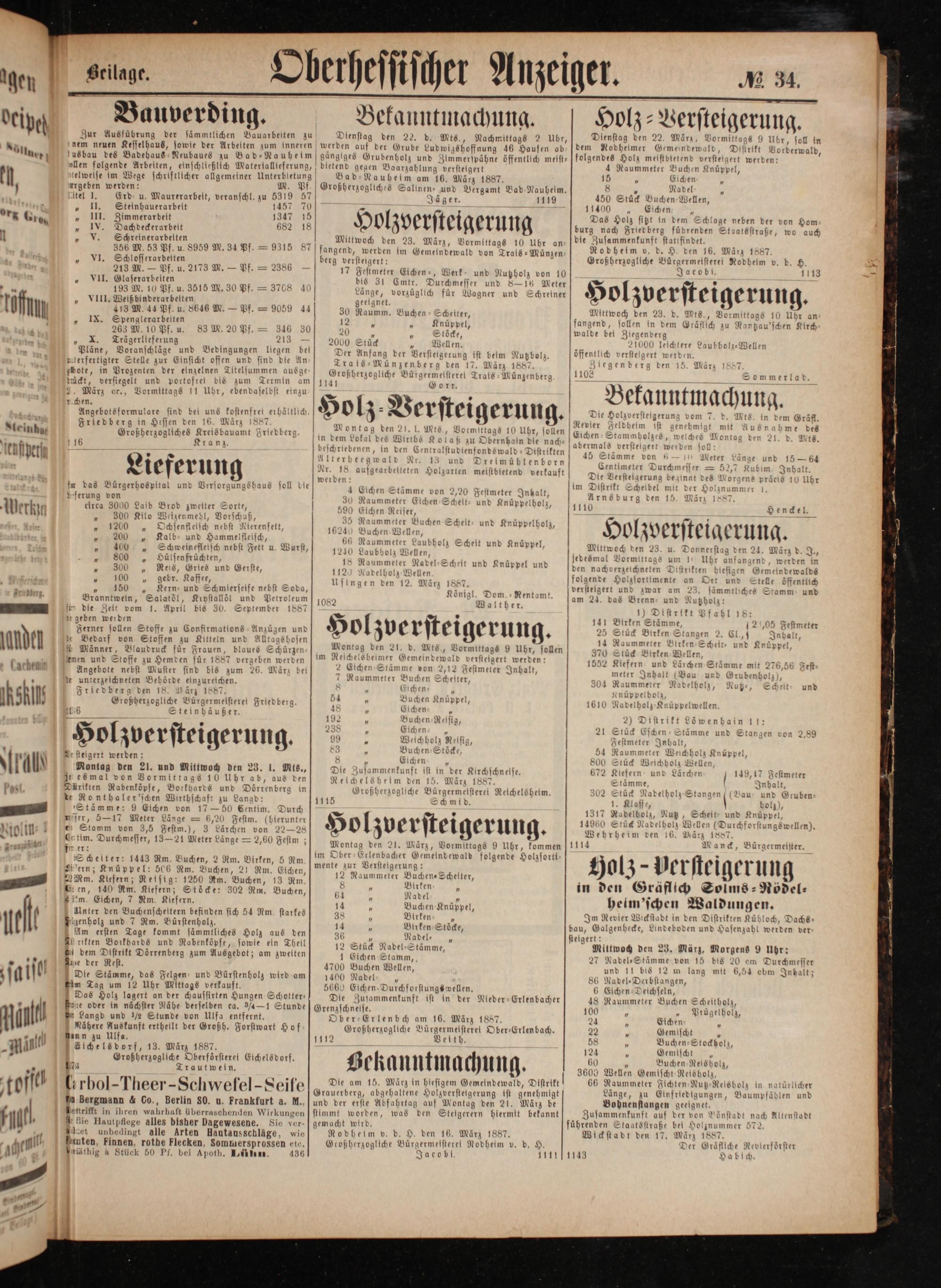 Der Anfang der Versleigetung ist beim Nutzbolz. Münzenberg den 17. März 1887. eee Bürgermelsterei Trats-Münzenberg Gorr.