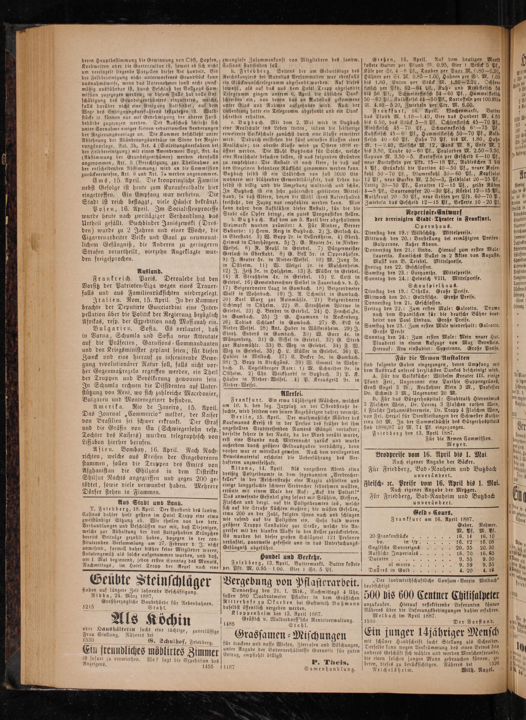 Geld ⸗ Cours. Frankfurt am 16. April 1887. Geber. M. Pf. 16. 14