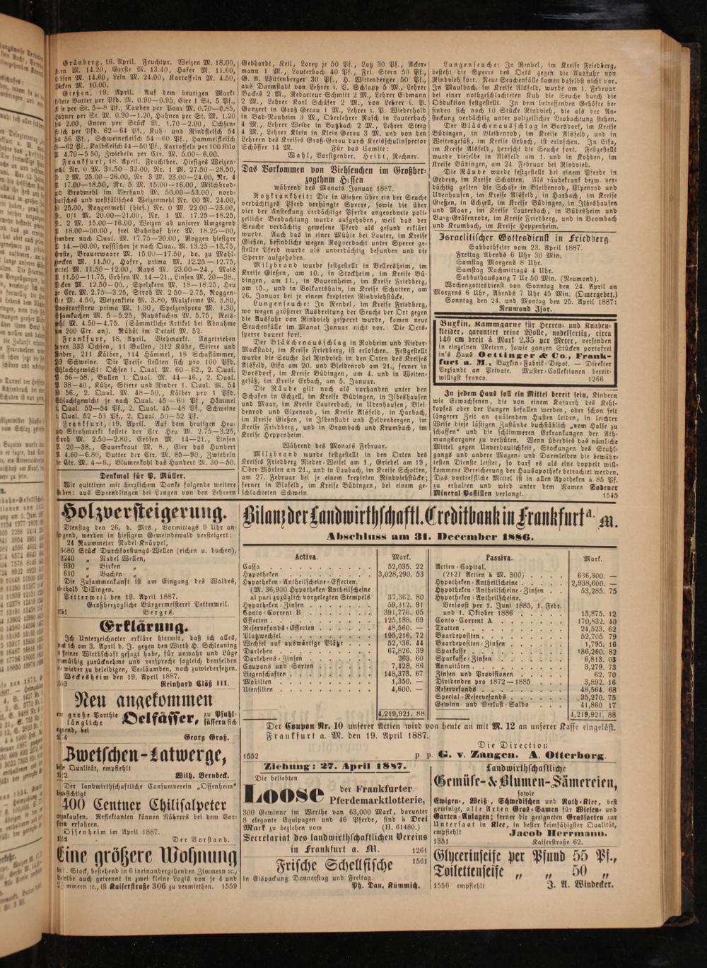 1552 8 FTichung: 27. April 1887. Die beliebten 2 der Frankfurter Loose Pferdemarktlotterie, 300 Gewinne im Werthe von 63,000 Mark, darunter