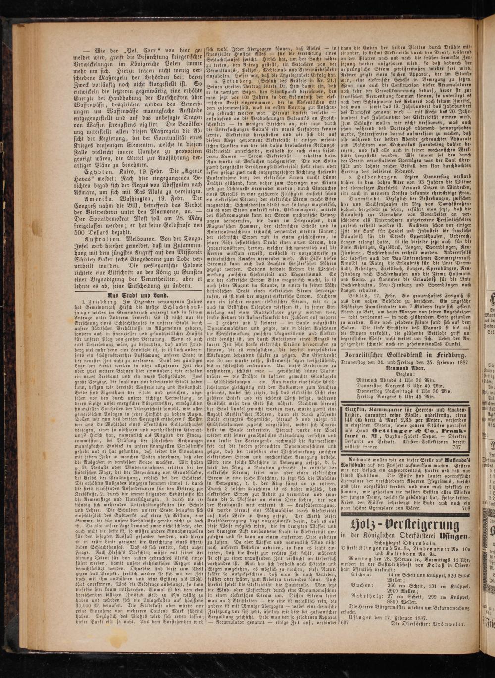 n. Friedberg.(Schluß des Artikels in Nr. 21.) Seinen zweiten Vortrag leitete Dr. Heid damit eln, daß er in wenigen Sätzen den Standpunkt bezeichnete, den man jetzt vor 100 Jahren in der Erkenntniß der elek⸗ trischen Kraft eingenommen, der im Wesentlichen mit dem zusammenfällt, was im ersten Vortrag zur Anschau— ung gebracht worden war. Hierauf deutete derselbe— anknuͤpfend an die Beobachtungen Galvant's an Frosch— schenkeln— in wenigen Strichen an, wie man durch die Untersuchungen Volta's ein neues Verfahren kennen lernte, Elektrieltät herzustellen und wie sich die auf diesem Wege gewonnene Elektrieltät in einigen wesent⸗ lichen Punkten von der bis dahin beobachteten Relbungs Elektrieltät unterscheide, weshalb sie auch einen beson— deren Namen— Strom-Elektrieität— erhalten habe. Nun wurde an Versuchen nachgewiesen: Die von Volta zuerst hergestellte Berührungs-Elektrieität stellt einen oder besser gesagt zwei nach entgegengesetzter Richtung fließende Funkenströme dar; der elektrische Strom macht dünne Drähte glühend, kann daher zum Sprengen von Minen und zur Lichtquelle verwendet werden; durch Eintauchen eines Metalls in eine gesäuerte Flüssigkett entsteht schon ein elektrischer Strom; der elektrische Strom macht Elsen magnetisch; Schmiedeetsen bleibt nur so lange magnetisch, als es vom Strom umkreist wird, Elektromagnet; mittels der Elektromagnete kann der Strom mechanische Beweg— ungen hervorrufen, die dann im Telegraphen, dem Wagner'schen Hammer, der elektrischen Schelle und in Rotationsmaschinen technisch verwendet werden können; der elektrische Strom ruft in einem geschlossenen, in seiner Nähe befindlichen Draht einen neuen Strom, den Inductlonsstrom, hervor, welcher sich namentlich auf die Nerven wirksam erweist, weshalb er vorzugsweise zu medleinischen Zwecken verwendet wird. Mit Hilfe dieses Stromes kann auch das Leuchten Geißler'scher Röhren gezeigt werden. Sodann betonte Redner die Wechsel— wirkung zwischen Elektrieität und Magnetismus. So wie der elektrische Strom Eisen magnetisch macht, so ist auch jeder Magnet im Stande, in einem in seiner Nähe befindlichen Draht einen elektrischen Strom hervorzu— rufen, es ist dies der magnet elektrische Strom. Nachdem nun ein solcher magnet elektrischer Strom, wie er ja auch im Bell'schen Telephon wirksam ist, in seiner Ein wirkung auf einen Multiplikator gezeigt worden war, lenkte Redner die Aufmerksamkeit der Zuhörer auf mehrere — 2 größere und 2 kleinere— im Saale aufgestellte Dynamomaschinen und zeigte, wie in diesen Maschinen die Wechselwirkung zwischen Magnetismus und Elektri— cttät benützt ist, um durch Rotattonen eines Ringes in kurzer Zeit sehr starke elektrische Ströme hervorrufen zu können, die es ermöglichen, die bereits vorgeführten Wirkungen bedeutend stärker zu zeigen. Ein Eisendraht von 30 om wurde roth, stellenweise sogar weißglühend, bis er schließlich verbrannte. Um dieses Verbrennen zu verhindern, schließt man— gewöhnlich dünne Platin drähte— die Drähte in luftleer gemachte Glaskugeln — Glühlichtlampen— ein. Nun wurde eine solche Glüh— lichtlampe gleichzeitig mit den Gaslampen zum Leuchten gebracht, wobei sich zeigte, daß das elektrtsche Licht eine größere Stärke und ein schönes Weiß besitzt, während Gaslicht mehr dem Gelb sich nähert. Nachdem hierauf der Saal dunkel gemacht worden war, wurde zuerst eine Anzahl Geißler'scher Röhren, dann ein durch glühende Kohle erzteugtes Bogenlicht, hierauf 5 und zuletzt 10 Glühlichtlampen zugleich vorgeführt, wobet sich Tages— helle im Saale verbreitete. Hierauf wurde der Saal wieder mit seiner gewöhnlichen Beleuchtung versehen und nun lenkte der Vortragende nochmals die Aufmerksam— keit auf die soeben gebrauchten Dynamomaschinen und zeigte, daß bei denselben eine Wechselwirkung zwischen elektrischem Strom und mechanischer Bewegung bestehe. Wird eine solche Maschine in Bewegung geseßzt, d. h. wird der Ring in Rotation gebracht, so entsteht der elektrische Strom; leitet man aber einen elektrtschen Strom in eine solche Maschine, so setzt sich die Maschine in Bewegung, d. h. der Ring fängt an zu rotiren. Durch 2 solcher Maschinen ist es daher möglich, den elektrischen Strom zur Arbeit zu verwenden und zwar kann die 2. Maschine an einem Orte stehen, der von der Kraftquelle weit entfernt ist— Kraftübertragung. Es wurde hierauf eine Nähmaschine durch Elektrieität auf diese Weise in Gang gesetzt. Der Werth dtieser Kraftübertragung liegt vorzugsweise darin, daß es auf diese Welse möglich wird, die im bewegten Wasser und der bewegten Luft vorhandene Kraft in Elektrieität um— zusetzen und sie dann an einem entfernten Orte arbeiten zu lassen. Da aber Wasser und namentlich Wind nicht nach unserem Belieben arbeiten, so kann es leicht ein— treten, daß die Kraft zur rechten Zeit fehlt, während sie oft zu einer unpassenden Zeit vielleicht im Ueberfluß vorhanden ist. Man hat sich deshalb nach Mitteln und Wegen umgesehen, es möglich zu machen, diese Natur— kräfte so aufzuspeichern, daß man sie nach Belieben, früher oder später, zum Arbeiten verwenden könne. Auch hierbei splelt die Elektriettät die Hauptrolle. Man setzt die Wind- oder Wasserkraft durch eine Dynamomaschine in einen elektrischen Strom um. Diesen Strom leltet man an 2 Bleiplatten— die eine ist metallisch rein, die andere ist mit Mennige überzogen— wobet eine schemtsche Zersetzung vor sich geht, ähnlich wie dies bei galvanischer Vergoldung geschleht. Hebt man den so geladenen Apparat