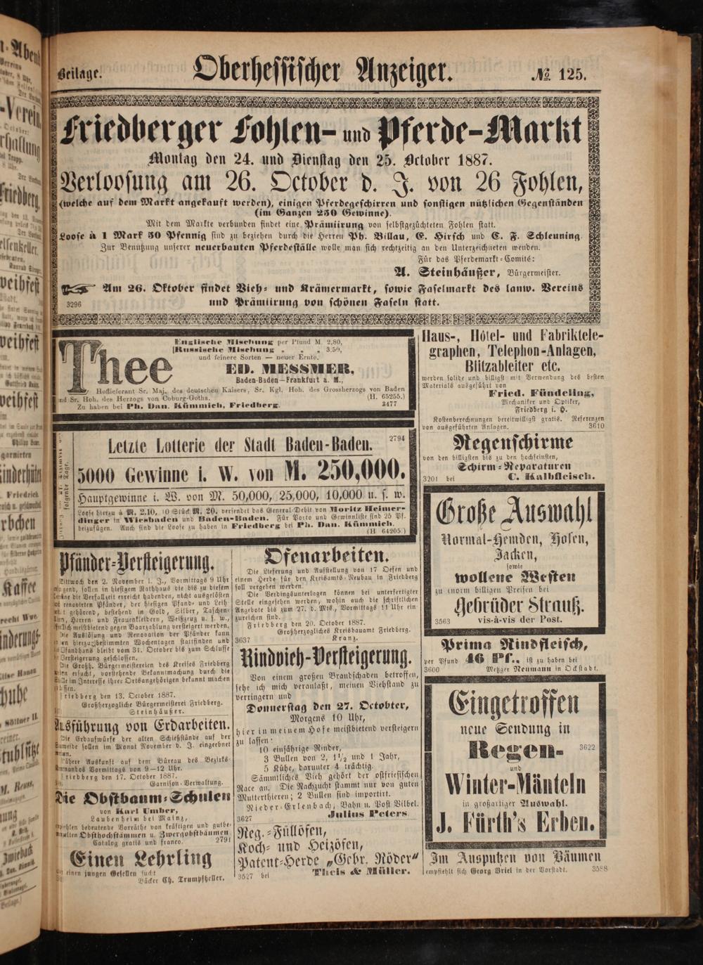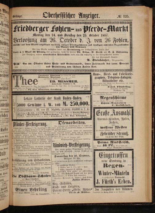 Mit dem Markte verbunden findet eine Prämiirung von selbstgezüchteten Fohlen statt. 5 Loose a 1 Mark 30 Pfennig sind zu beziehen durch die Herren Ph. Zur Benutzung unserer neuerbauten Pferdeställe wolle man sich rechtzeitig an den Unterzeichneten wenden. Für das Pferdemarkt-Comité: