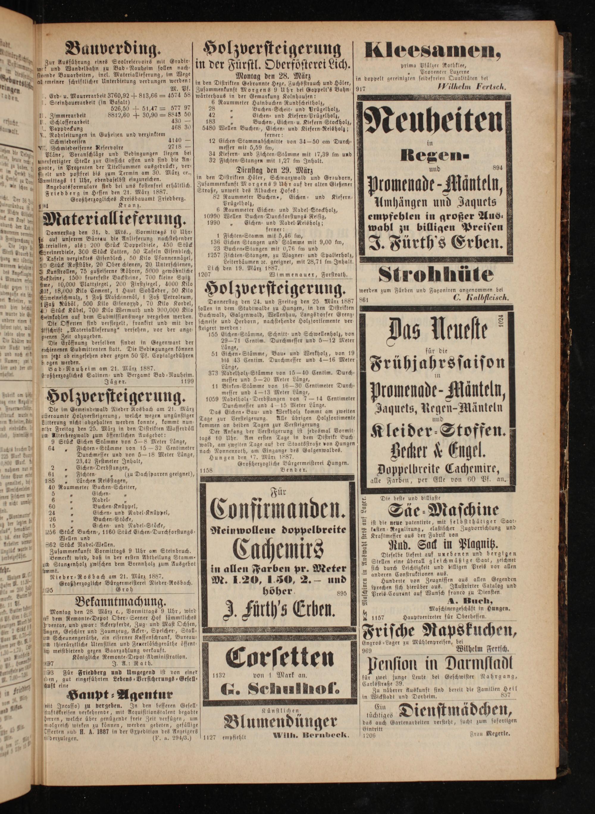 Damittags 11 Uhr, ebendaselbst einzureichen. Angebotsformulaxe sind bei uns kostenfrei erhaltlich. Friedberg in Hessen den 21. März 1887.