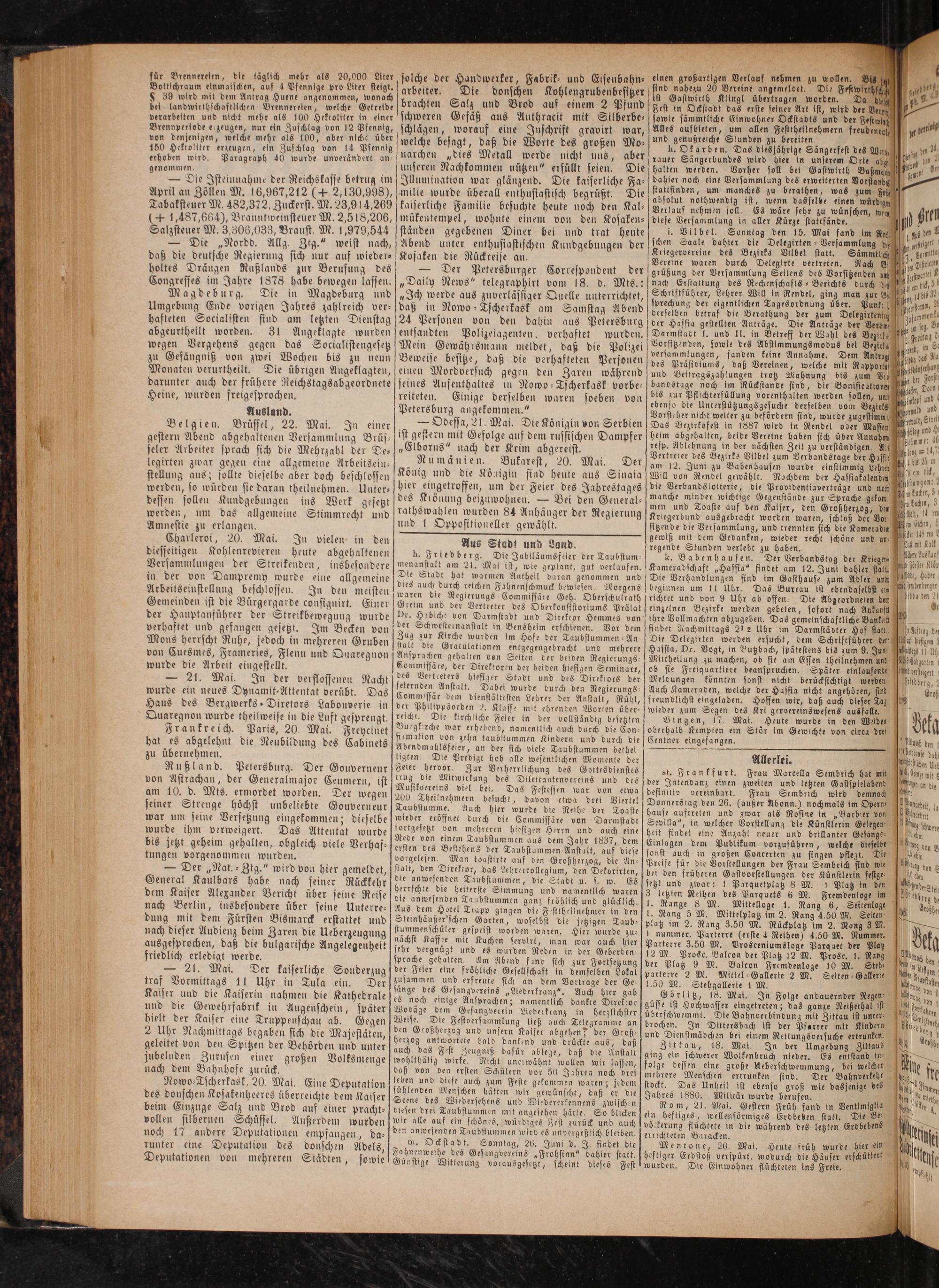 h. Friedberg. Die Jublläumsfeier der Taubstum— menanstalt am 21. Mal ist, wie geplant, gut verlaufen. Die Stadt hat warmen Antheil daran genommen und dies auch durch reichen Fahnenschmuck bewlesen. Morgens waren die Regierungs Commissäre Geh. Oberschulrath Greim und der Vertreter des Oberkonsistoriums Prälat