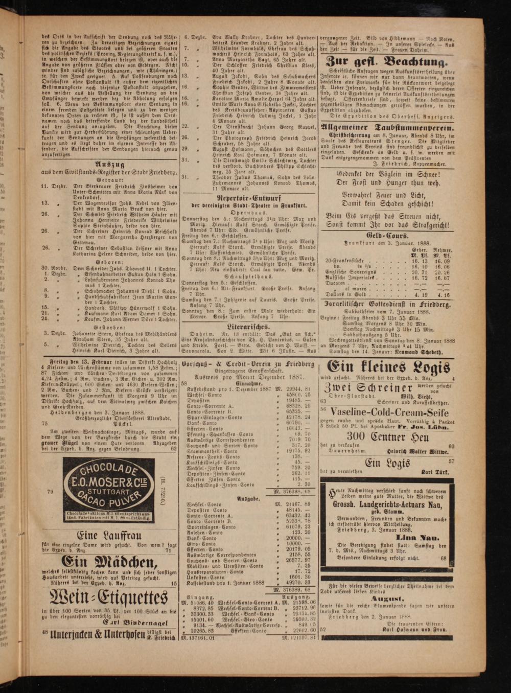 Ausweis pro Monat Dezember 1887 wird gesucht. Näheres bei der Exped. d. Anz. 4 1 58 Einnahme. U 1272 werden gesucht Kassebestand pro 1. Dezember 1887 M. 29944. 81 2 w E U— ch 1 E 1 I E 1 von Wechsel Conto„ 18800 25[ Oder⸗Florstadt Wilh. Viehl, ee 5 415 88 63 Schreiner und Karussellbesitzer. Fonto-Corrente A. 9 8328. 25 2 0 ——. 8 5 56 5 2* 1— 3 Conte Gorrente i. 0820.„ Vaseline-Cold-Cream-Seife Spar⸗Einlagen-Conto„ 42178. 24„ J 5 5 Bank ⸗Conto 89070 gegen rauhe un spröde Haut. Vorräthig à Packet Effecten Conto 16643. 3 Stück 50 Pf. bei Apotheker Fr. Jos. Lühn. Pfennig ⸗Sparkassen Conto* o9. 70 2 C 5 5 Auswärtige Correspondenten 1 7019. 70 300 entner Heu Coupons unt Sorten Conto 25 317. 20[bat zu verkaufen 5 60 Stammantbeil⸗Conto 19 706, 0 Bauernheim Heinrich Walter Wittwe. Reserve Fonds Conto* 138* 5 5 Kaufschillinigs Corto* 45.— Ein Logis 57 Wechsel⸗Zinsen Conto 799. 20 Ane u Depositen- Zinsen Conto 5 262. 11 1 t zu vermiethen Karl Türk. Effreten Zinsen Conto 5 115.— Kaufschillings Zinsen Conto 2. 90 D. Jgd Teute Nachmittag verschied sanft nach schwerem Ausgabe H Leiden meine gute Mutter, die Wittwe des Wechsel ⸗Conto M. 21467. 89 Grossh. Landgerichts-Actuars Nau, Depositen Conto„ 48145.— geb. Stamm. 5 5 63432. 42 2 Ea.* 5 7 155 78 Verwandten, Freunden und Bekannten mache eee 8 61079. 22 ich tiefbetrübt hiervon Mittheilung. Anleben 3 N 123. 20 Friedberg, 3. Januar 1888. 5 9. 2 Bank Conto„ 20000.— Lina Nau. Gtro⸗Conto 5 40000. 5 Die Beerdigung findet statt: Samstag den Effecten Conto 1 90041 5 7. d. Mts., Nachmittags 3 Uhr. d 5 0 2158. ö denen n geln di,: 28„% eee de fe v, ee „ 236577. L Mobllien- und Utensilten-Conto 5 7. 20 Haus kreparaturen Conte 9 H. 72 asesene den e———— 888 9270. 88 0 Kassebestand pro 1. Januar 1888 2.— 5 Für die vlelen Bewesse berzlicher Theilnabme bei dem M. 326389. 68 Tode unseres lieben Kindes Eingang. Ausgang. August. M. 51086. 40 Wechsel⸗Conto-Corrent A. M. 21598. 06 a 8 a 6 1 1 0 U d reiche B. spend sagen w seren „ 8372.85 Wechsel⸗Conto⸗Corrent B. 23712. 90 n reiche Blumenspende n wir unseren „ 33300. 33 Wechsel⸗Bank-Conto 29134. 85 Friedberg den 2. Januar 1888 „ 1500.60 Wechsel Giro Conto„ 29500. 32 0 0 3 N* „ 9194.— Wechsel⸗Auswärtige Gorresp.„ 849.00 Die trauernden Gitern: „ 20266. 83 Effekten Conto 22602, 6052 Rar Hofwaun und Frau. M. 137161. 01 M. 121397. 84
