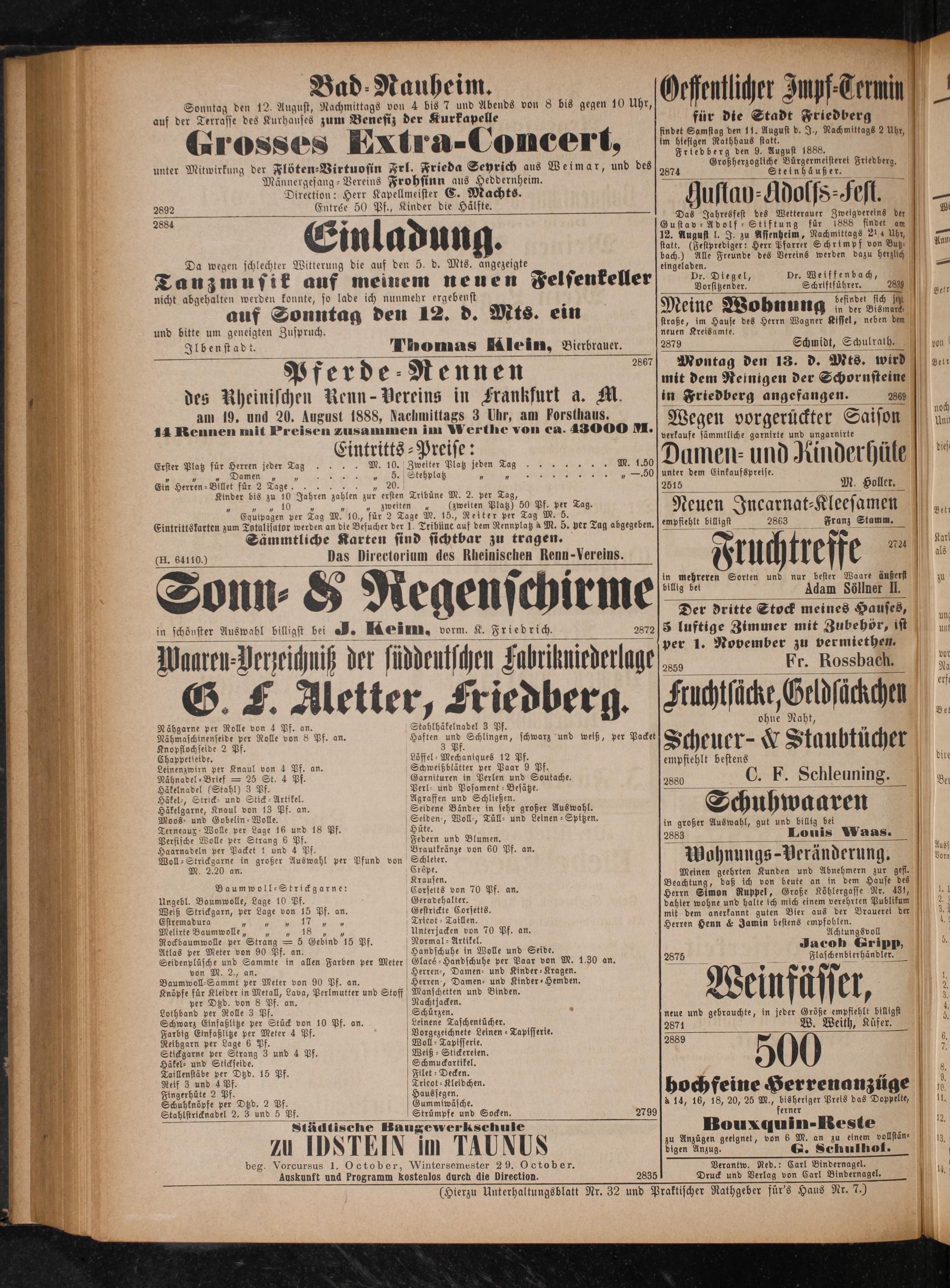 Das Jahresfest des Wetterauer Zweigvereins der Gustav⸗ Adolf Stiftung für 1888 findet am 12. August l. J. zu Assenheim, Nachmittags 2½ Uhr, statt.(Festprediger: Herr Pfarrer Schrümpf von Buß⸗ bach.) Alle Freunde des Vereins werden dazu herzlich