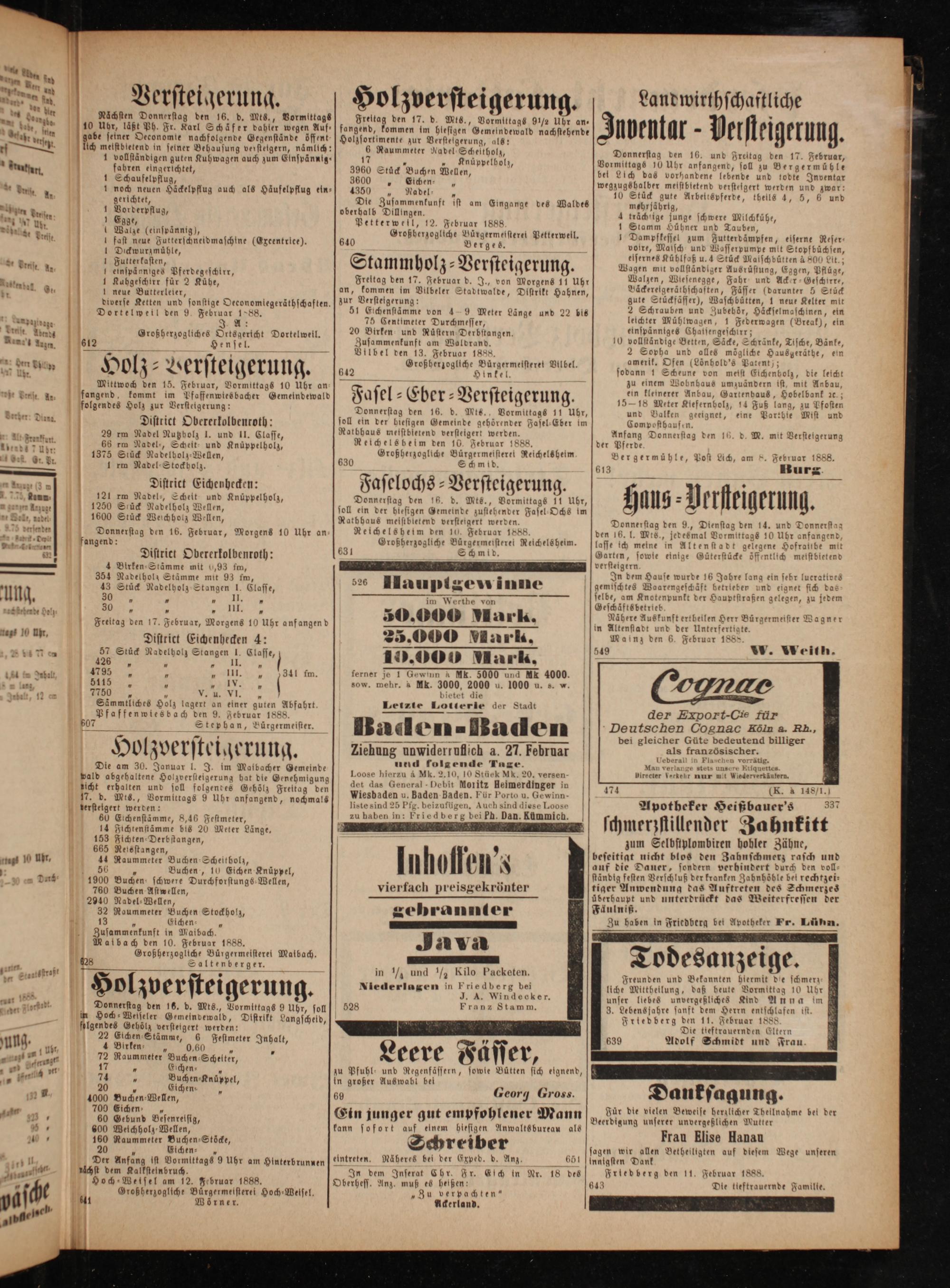 Stammholz⸗Versteigerung. Freitag den 17. Februar d. J., von Morgens 11 Uhr an, kommen im Vilbeler Stadtwalde, Distrikt Hahnen, zur Versteigerung: 51 Eichenstämme von 49 Meter Länge und 22 bis 75 Centimeter Durchmesser, 20 Birken und Ruͤstern Derbstangen. Zusammenkunft am Waldrand. Vilbel den 13. Februar 1888. Großherzogliche Bürgermeisteret Vilbel. Hinkel.
