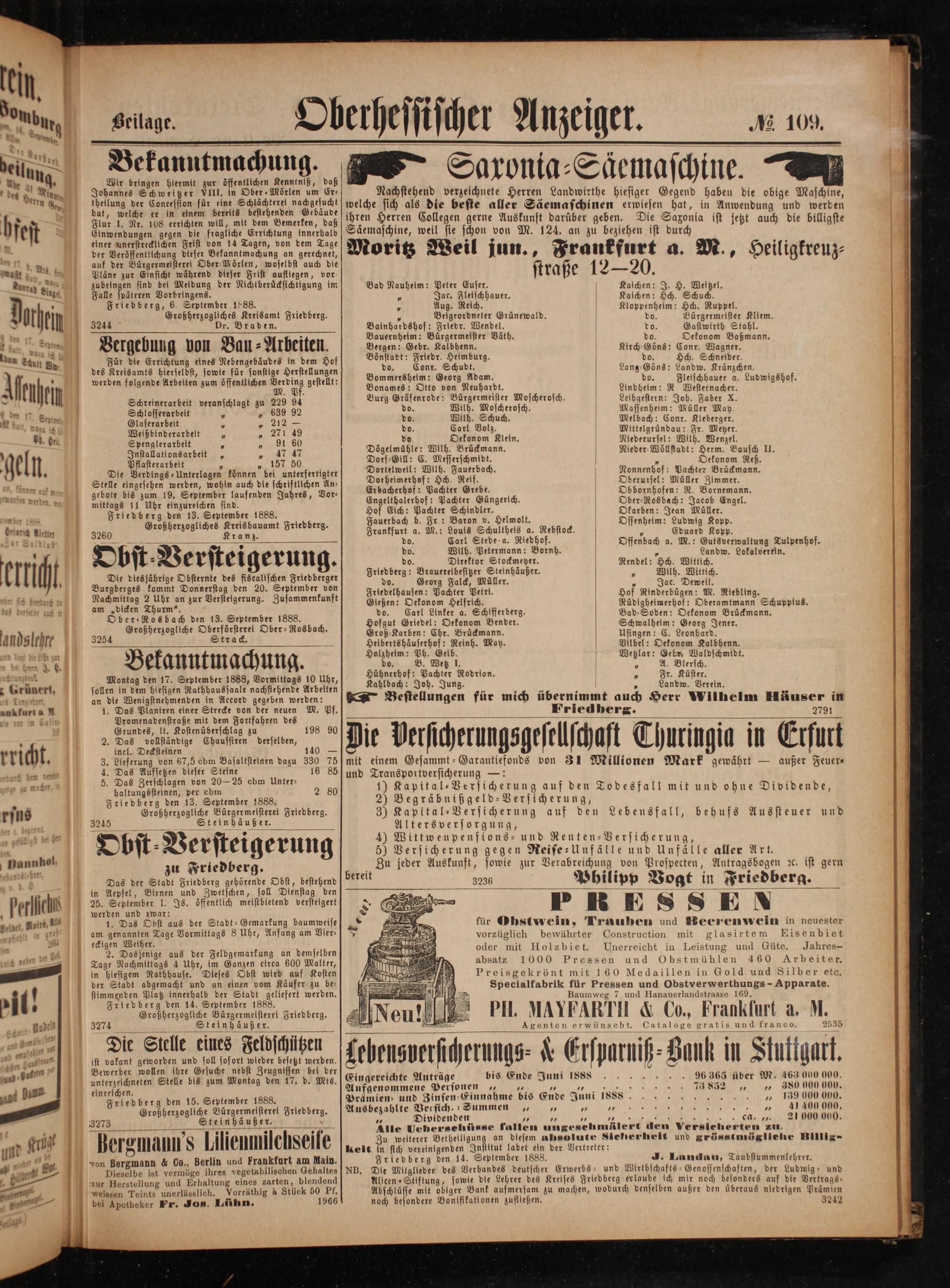 1 o. Petermann: Bornh. 1 andw. Lokalverein. 1 1 Obst⸗Versteigerung. do. Direktor Stockmeyer. Rendel: Och. Witlich. 0 Il Die viesjährige Obsternte des fiseallschen Friedberger Fri berg! e eee„ Wilh. Wittich. 4 0 5 g Falck, Müller. 5 Jae. Deweil. 7 f 1 kommt Donnerstag den 20. e Frledelhausen: Pachter Petri. Hof Rinderbügen: M. Riebling. 5 ert iich kierdurch du achmittag 2 Uhr 555 zur Versteigerung. Zusammenkunft Gießen: Oekonom Helfrich. Rüdigheimerhof: Oberamtmann Schuppius. 1 deß berselbt zu n am dicken Thurm“. do Carl Linker a. Schlfferberg. Bad Soden: Oekonom Brückmann 1 1 Ober⸗Rosbach den 13. September 1888. Hofgut Griedel: Orkonom Bender. Schwalhelm: Geseg Irner 5 * 19 1 Großherzogliche Oberförsterei Ober-Rosbach. Groß-Karben: Chr. Brückmann. Ufingen: E Seunberd 5 N ans lehre 32⁵⁴ Strack.. Heibertshäuserhof: Reinh. May. Vilbel: Oekonom Kalbhenn. 1d buen bir An zu 5 E t Holzheim: Ph. Geib. Wetzlar: Gebr. Waldschmidt. 5 80 Bekanntmachung. en ee 5 2 Wand ö Montag den 17. September 1888, Vormittags 10 Uhr, Lace n N*. a b rünert, sollen in dem hiesigen Rathhaussaale nachstehende Arbeiten 8 5 22 1 5 5 N F 8 1 Teri chrer an die Wenigstnehmenden in Accord gegeben werden:— Bestellungen für mich übernimmt auch Herr Wilhelm Häuser in ank furt a N 1. Das Planiren einer Strecke von der neuen M. Pf. Friedberg. 2791 1. ret in Casi Promenadenstraße mit dem Fortfahren des 2 5 85 7 7 11 Grundes, lt. Kostenüberschlag zu 198 90 0 14 2. Das vollständige Chaussiren derselben, le El U kkungsge k I huringia in 1 I f incl. Decksteinen 140— ‚ rricht. 3. Lieferung von 67,5 ebm Basaltsteinen dazu 330 75 mit einem Gesammt-Garantiefonds von 31 Millionen Mark gewährt— außer Feuer⸗ aun ben e 5 5 2 0 8 Aa 16 85 und Transportversicherung—: f *„ 26% 5.. 2 80 1) Kapital⸗Versicherung auf den Todesfall mit und ohne Dividende, 4 * 1 Friedberg den 13. September 1888. 2) Begraͤbnißgeld⸗Versicherung, 5 rsus 19 Großherzogliche Bürger meisteret Friedberg. 3) Kapital⸗Versicherung auf den Lebensfall, behufs Aussteuer und N r. Altersversorgung, d be 1 7 4) Wittwenpensions- und Renten⸗Versicherung, a Obst⸗Versteigerung 5) Versicherung gegen Reise-Unfälle und Unfälle aller Art. f nannhol, zu Friedberg. Zu jeder Auskunft, sowie zur Verabreichung von Prospecten„ Antragsbogen zc. ist gern Das der Stadt Friedberg gehörende Obs, bench bereit 3236 Philipp Vogt in Friedberg. g 3 in Aepfel, Birnen und Zwetschen, soll Dienstag den 5 5—— 8 Perlicha 5 öffentlich meistbietend versteigert P IR H S. E* a für Obstwein, Trauben und Becrenwein in neuester