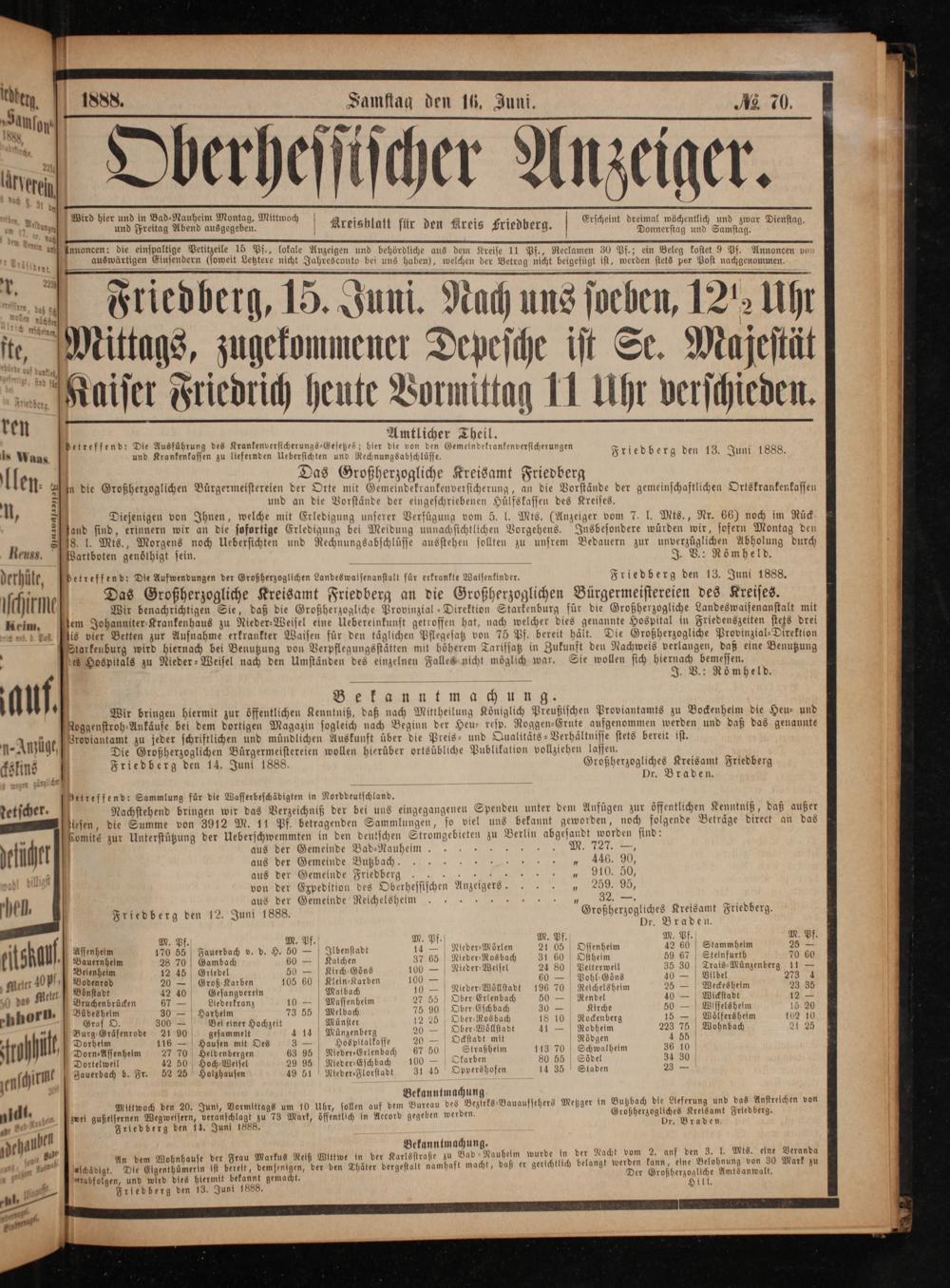 a und an die Vorſtände der eingeſchriebenen Hülfskaſſen des Kreiſes. f Diejenigen von Ihnen, welche mit Erledigung unſerer Verfügung vom 5. l. Mts.(Anzeiger vom 7. l. Mts., Nr. 66) noch im Rück— and ſind, erinnern wir an die ſofortige Erledigung bei Meidung unnachſichtlichen Vorgehens. Insbeſondere würden wir, ſofern Montag den 8. l. Mts., Morgens noch Ueberſichten und Rechnungsabſchlüſſe ausſtehen ſollten zu unſrem Bedauern zur unverzüglichen Abholung durch Bartboten genöthigt ſein. J. V.: Römheld. 1 7 Petreffend! Die Aufwendungen der Großherzoglichen Landes walſenanſtalt für erkrankte Walſenkinder. Friedberg den 13. Juni 1888. 1 7 7 5 1„ 7 a 8 1 N Das Großherzogliche Kreisamt Friedberg an die Großherzoglichen Bürgermeiſtereien des Kreiſes. 1 ö Wir benachrichtigen Sie, daß die Großherzogliche Provinzial-Direktion Starkenburg für die Großherzogliche Landeswaiſenanſtalt mit 13 N g 9 f* b N winzial N zoglich b 1 dem Johanniter⸗Krankenhaus zu Nieder-Weiſel eine Uebereinkunft getroffen hat, nach welcher dies genannte Hospital in Friedenszeiten ſtets drei 1 lis vier Betten zur Aufnahme erkrankter Waiſen für den täglichen Pflegeſatz von 75 Pf. bereit hält. Die Großherzogliche Provinzial-Direktion 1 Starkenburg wird hiernach bei Benutzung von Verpflegungsſtätten mit höherem Tarifſatz in Zukunft den Nachweis verlangen, daß eine Benutzung 4 es Hospitals zu Nieder⸗Weiſel nach den Umſtänden des einzelnen Falles nicht möglich war. Sie wollen ſich hiernach bemeſſen. 1 0 J. V.: Römheld. 1 Bekanntmachung.* ö Wir bringen hiermit zur öffentlichen Kenntniß, daß nach Mittheilung Königlich Preußiſchen Proviantamts zu Bockenheim die Heu- und 1 Roggenſtroh⸗Ankäufe bei dem dortigen Magazin ſogleich nach Beginn der Heu- reſp. Roggen-Ernte aufgenommen werden und daß das genannte. Groviantamt zu jeder ſchriftlichen und mündlichen Auskunft über die Preis- und Qualitäts-Verhältniſſe ſtets bereit iſt. 4 Die Großherzoglichen Buͤrgermeiſtereien wollen hierüber ortsübliche Publikation vollziehen laſſen. 1 Friedberg den 14. Juni 1888. Großherzogliches Kreisamt Friedberg N Dr. Braden. 13 ee. Sammlung für die Waſſerbeſchädigten in Norddeutſchland. 0 4 Nachſtehend bringen wir das Verzeichniß der bei uns eingegangenen Spenden unter dem Anfügen zur öffentlichen Kenntniß, daß außer N 1 leſen, die Summe von 3912 M. 11 Pf. betragenden Sammlungen, ſo viel uns bekannt geworden, noch folgende Beträge direct an das 15 Comité zur Unterſtützung der Ueberſchwemmten in den deutſchen Stromgebieten zu Berlin abgeſandt worden ſind: 5 aus der Gemeinde Bad-Nauheime. 5 M. 727.—, 5 aus der Gemeinde Butzbach.„ 446. 90,* aus der Gemeinde Friedberg„ 910. 50, 1 von der Expedition des Oberheſſiſchen Anzeigers. 5* aus der Gemeinde Reichelsheim 5 1 32.—. 8 0. 1 N Friedberg den 12. Juni 1888. Großherzogliches Kreisamt Friedberg. 1 Dr. Braden. 104 0 Pf. M. Pf. M. Pf. M. Pf. M. Pf. g M. Pf 1 9 Aſſenheim 3 7 Fauerbach v. d. H. 50 2 Ilbenſtadt 14— Nleder⸗Mörlen 2105 Oſſenheim 42 60 Stammheim 25 2. Bauernhelm 28 70 Gambach 60— Kalchen 37 65 Nieder⸗Rosbach 31 60 Oſtheim 59 67 Steinfurth 70 60 0 Belenheim 12 45 Griedel 50— Kirch⸗Göns 100— Nieder⸗-⸗Weiſel 24 80 Petterwell 35 30[Trais⸗Münzenberg 11— 8 Bodenrod 20— Groß Karben 105 60 Klein-Karben 100—. 60— Pohl-Göns 40— Vilbel 278 4 Boönſtadt 42 40 Geſangverein Malbach 10— Nleder-Wöllſtadt 196 70 Reichelsheim 25— Weckes heim 23 35 Bruchenbrücken 67— Liederkranz 10— Maſſenheim 27 55 Ober Erlenbach 50— Rendel 40— Wickſtadt 12— Büdes helm 30— Harhelm 73 55 Melbach 75 90 Ober ⸗Eſchbach 30— Kirche 50— Wiſſelsheim 15 20 Graf O. 300— Bel einer Hochzeit Münſter 12 25 Ober-Rosbach 18 10 Rockenberg 15— Wölfersheim 102 10 Burg⸗Gräfenrode 21 90 geſammelt 414 Münzenberg 20— Ober ⸗Wöͤllſtadt 41— Rodheim 223 75 Wohnbach 21 25 Dorheim 116— Hauſen mit Oes 3— Hospftalkaſſe 20— Ockſtadt mit„ ARNadgen 4 55 Dorn-Aſſenheim 27 70 Heldenbergen 63 95 Nieder⸗Erlenbach 67 50 Straßhelm 113 70 Schwalheim 36 40. Dortelweil 42 50 Hoch⸗Weiſel 29 95 Nleder-Eſchbach 100— Okarben 80 55 Soͤdel 34 30 9 Jauerbach b. Fr. 52 25 Holzhauſen 49 51 Nleder⸗Florſtadt 3145 Oppershofen 14 35 Staden 23— 4 Bekanntmachung. Mittwoch den 20. Juni, Vormittags um 10 Uhr, ſollen auf dem Bureau des Bezirks-Bauaufſehers Metzger in Butzbach die Lieferung und das Anſtreichen von 1 b i 0 8 öffe ben werden. Großherzogliches Kreisamt Friedberg. 1 zwei gußelſernen Wegweiſern, veranſchlagt zu 73 Mark, öffentlich in Accord gegeben Die ö Friedberg den 14. Juni 1888. r. Braden. Bekanntmachung.