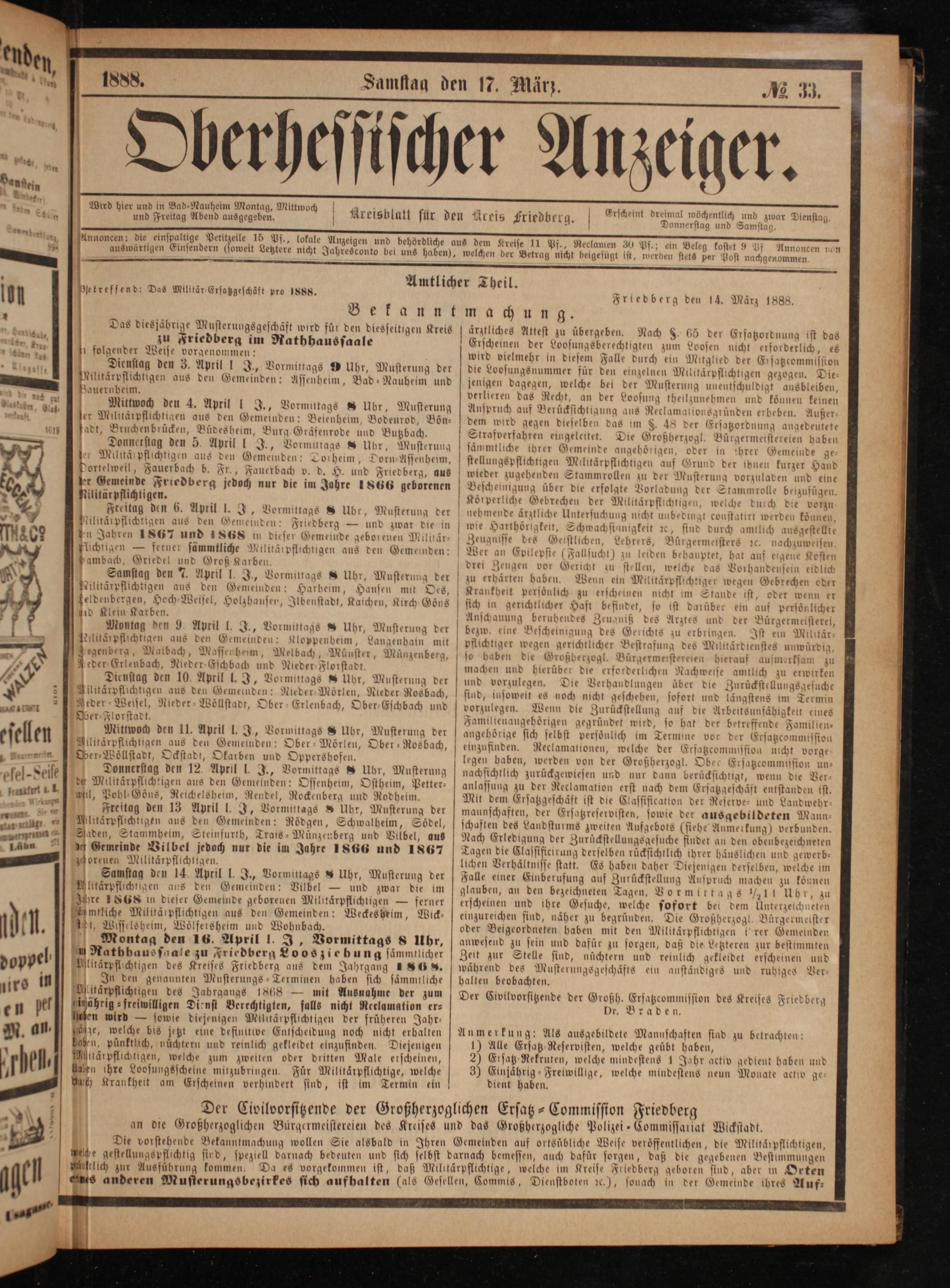 Freitag den 6. April l. J, Vormittags 8 Uhr, Muſterung der ilitärpflichtigen aus den Gemeinden: Friedberg— und zwar die in in Jahren 1867 und 1868 in dieſer Gemeinde geborenen Militär—