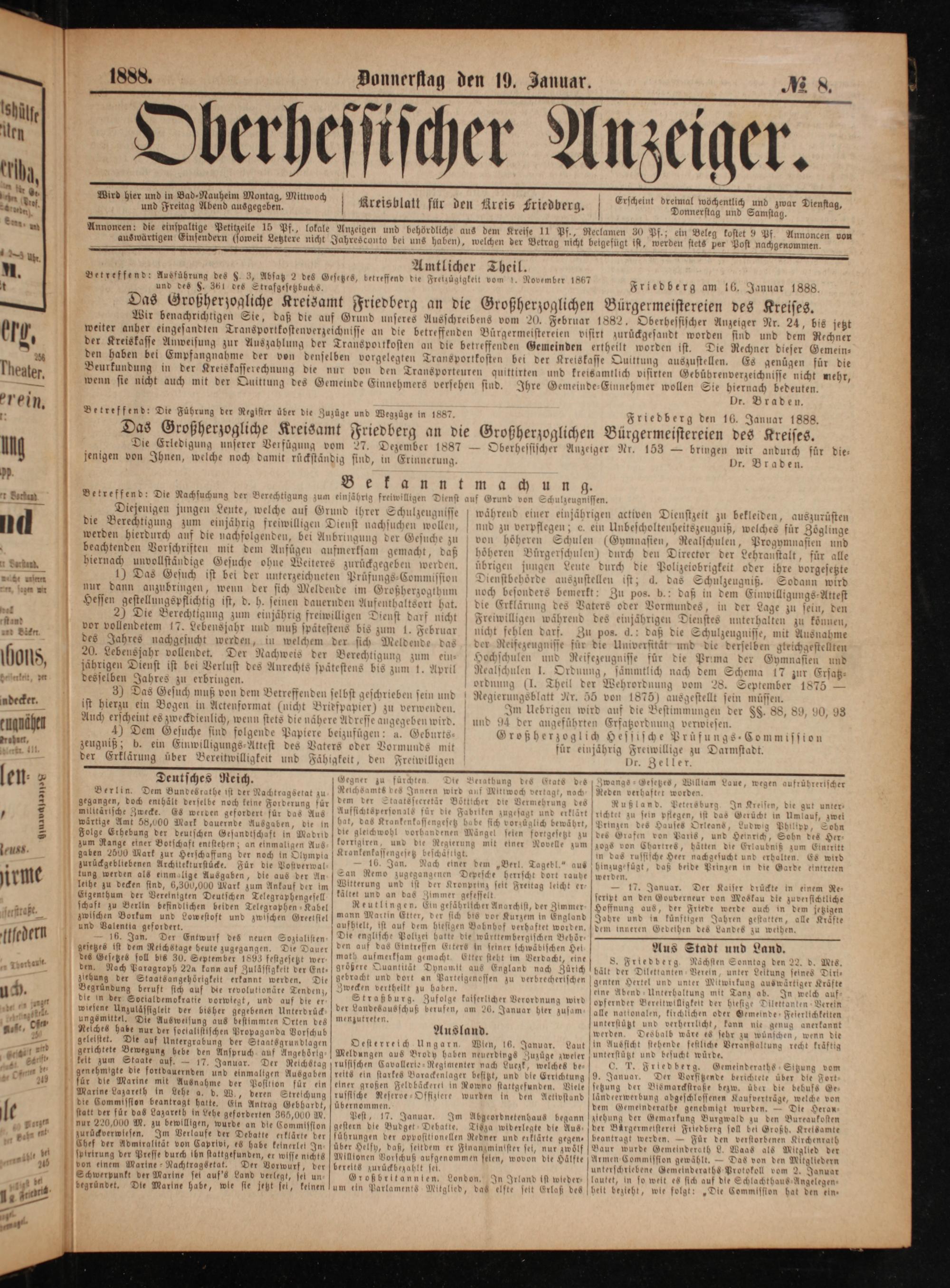Betreffend: Die Führung der Reglster über die Zuzüge und Wegzüge in 1887. Friedberg den 16. Januar 1888. Das Großherzogliche Kreisamt Friedberg an die Großherzoglichen Bürgermeistereien des Kreises. Die Erledigung unserer Verfügung vom 27. Dezember 1887— Oberhessischer Anzeiger Nr. 153— bringen wir andurch für die— jenigen von Ihnen, welche noch damit rückständig sind, in Erinnerung. Dr. Braden.