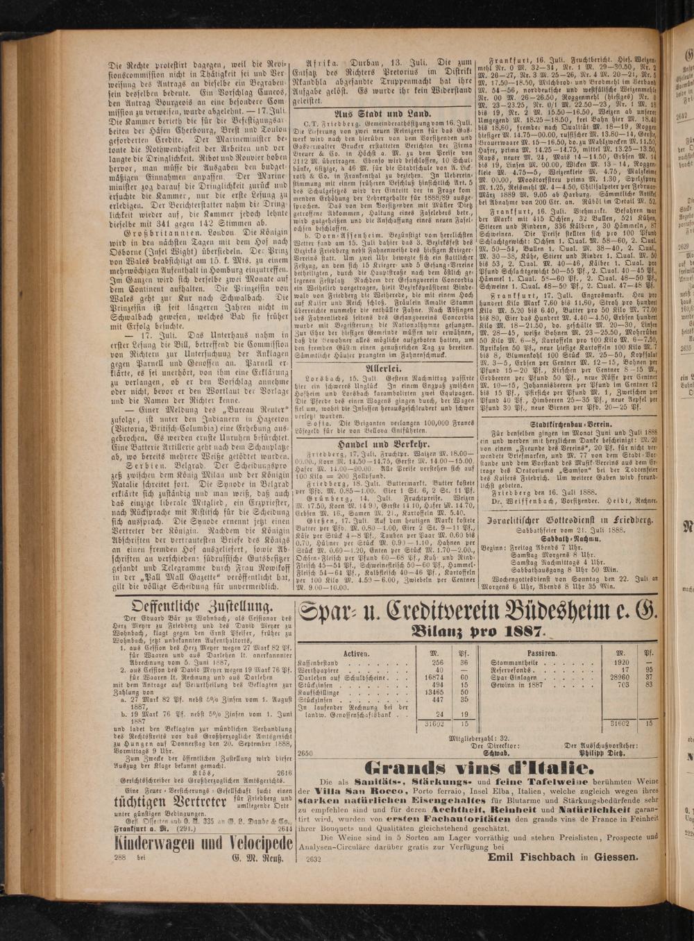 C. T. Friedberg. Gemeinderathssitzung vom 16. Jull. Die Lleferung von zwei neuen Reinigern für das Gas— werk wird nach den hierüber von dem Vorsitzenden und Gasverwalter Brucker erstatteten Berichten der Firma Breuer& Co. in Höchst a. M. zu dem Preise von 2112 M. übertragen. Ebenso wird beschlossen, 10 Schul⸗ bänke, 6sitzige, a 46 M. für die Stadtschule von A. Lick- roth& Co. in Frankenthal zu beziehen. In Ueberein— stimmung mit einem früheren Beschluß hinsichtlich Art. 5 des Schulgesetzes wird der Eintritt der in Frage kom; menden Erhöhung der Lehrergehalte für 1888/89 ausge— sprochen. Das von dem Vorsitzenden mit Müller Dietz getroffene Abkommen, Haltung eines Faselebers betr., wird gutgeheißen und die Anschaffung eines neuen Fasel— ochsen beschlossen.