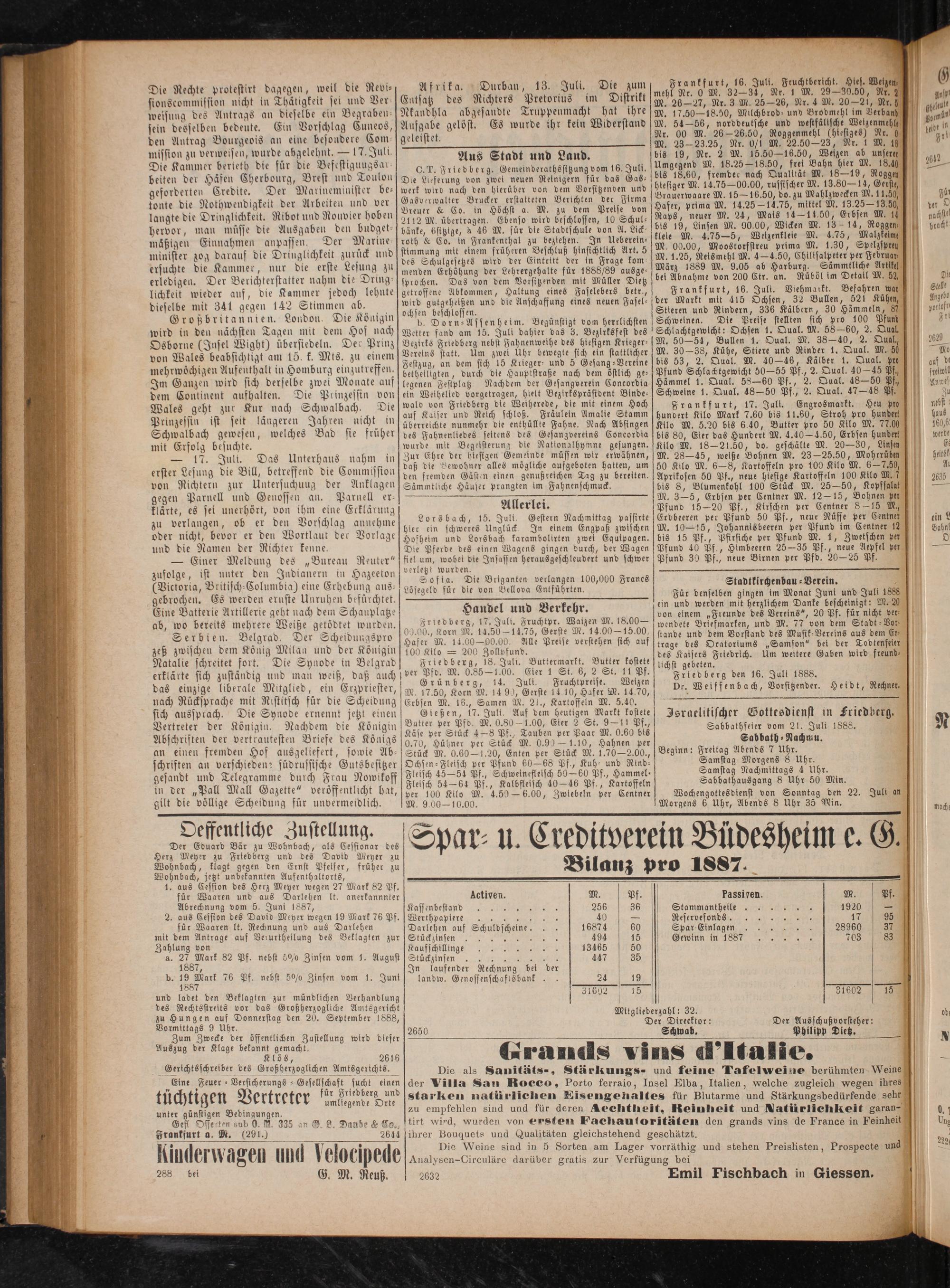 Stadtkirchenbau⸗Verein. 5 Für denselben gingen im Monat Juni und Juli 188 ein und werden mit herzlichem Danke bescheinigt: M. 20 von einem„Freunde des Vereins“, 20 Pf. für nicht ver⸗ wendete Briefmarken, und M. 77 von dem Stadt- Vor stande und dem Vorstand des Musik-Vereins aus dem Er trage des Oratoriums„Samson“ bei der Todtenfeter des Kaisers Friedrich. Um weitere Gaben wird freund— lichst gebeten. Frledberg den 16. Jult 1888. Dr. Weiffenbach, Vorsitzender. Heidt, Rechner,